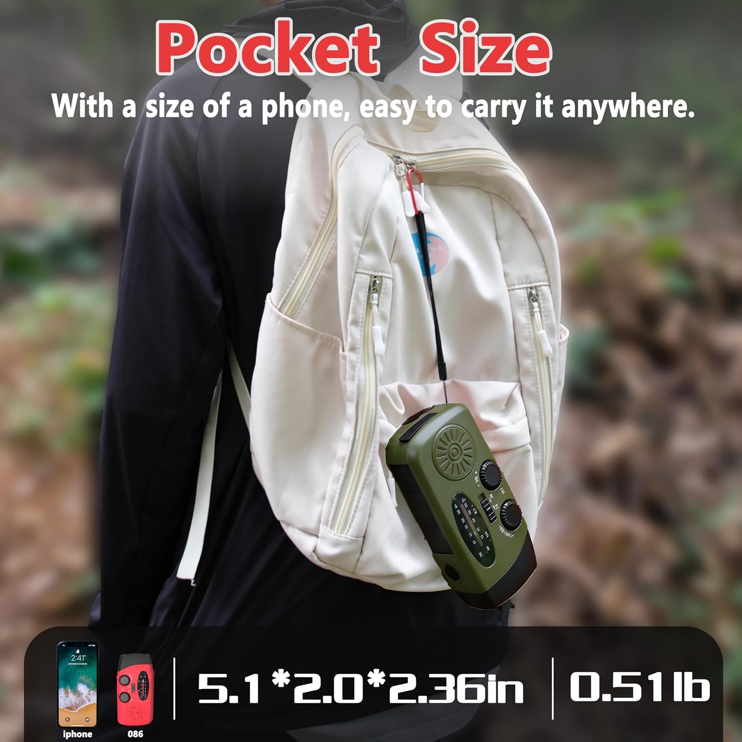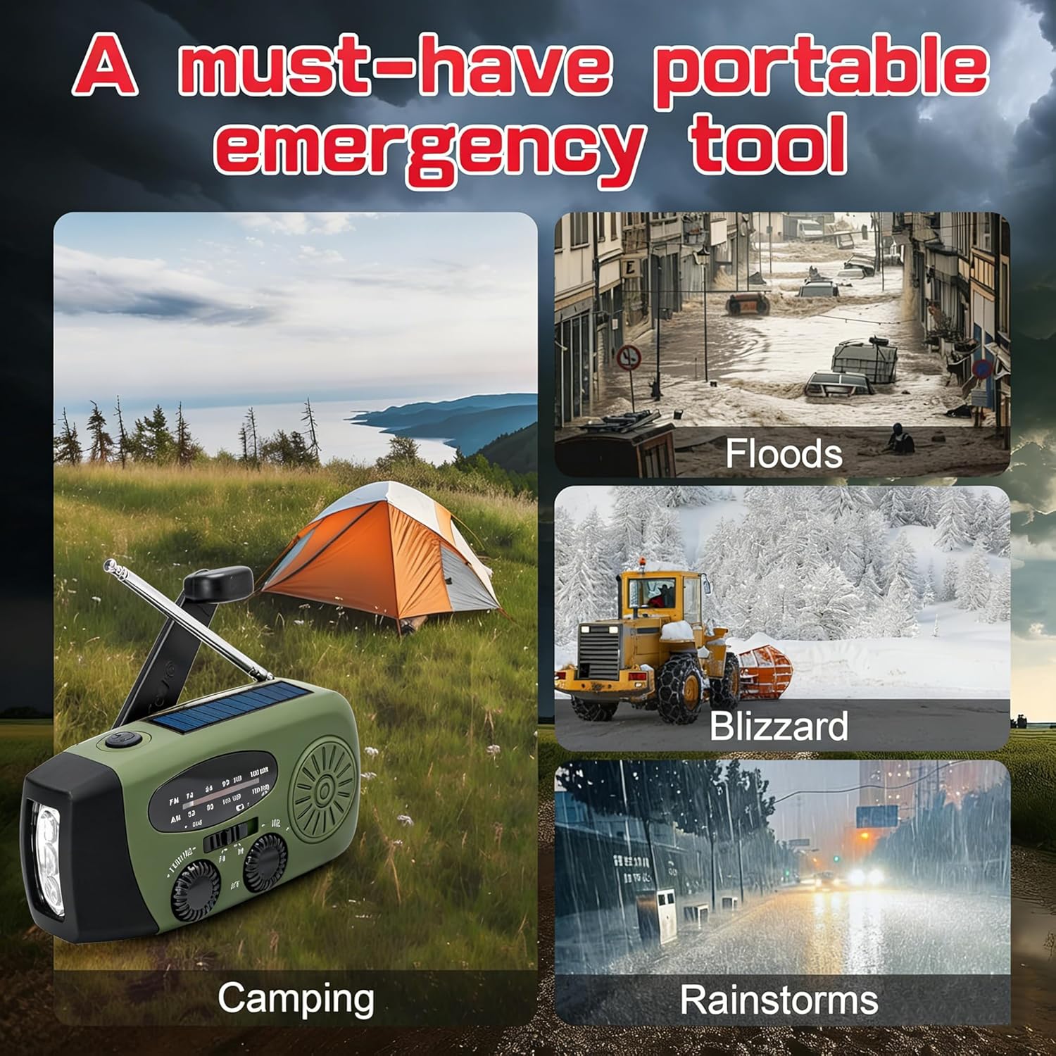 - Hand crank and solar charging options