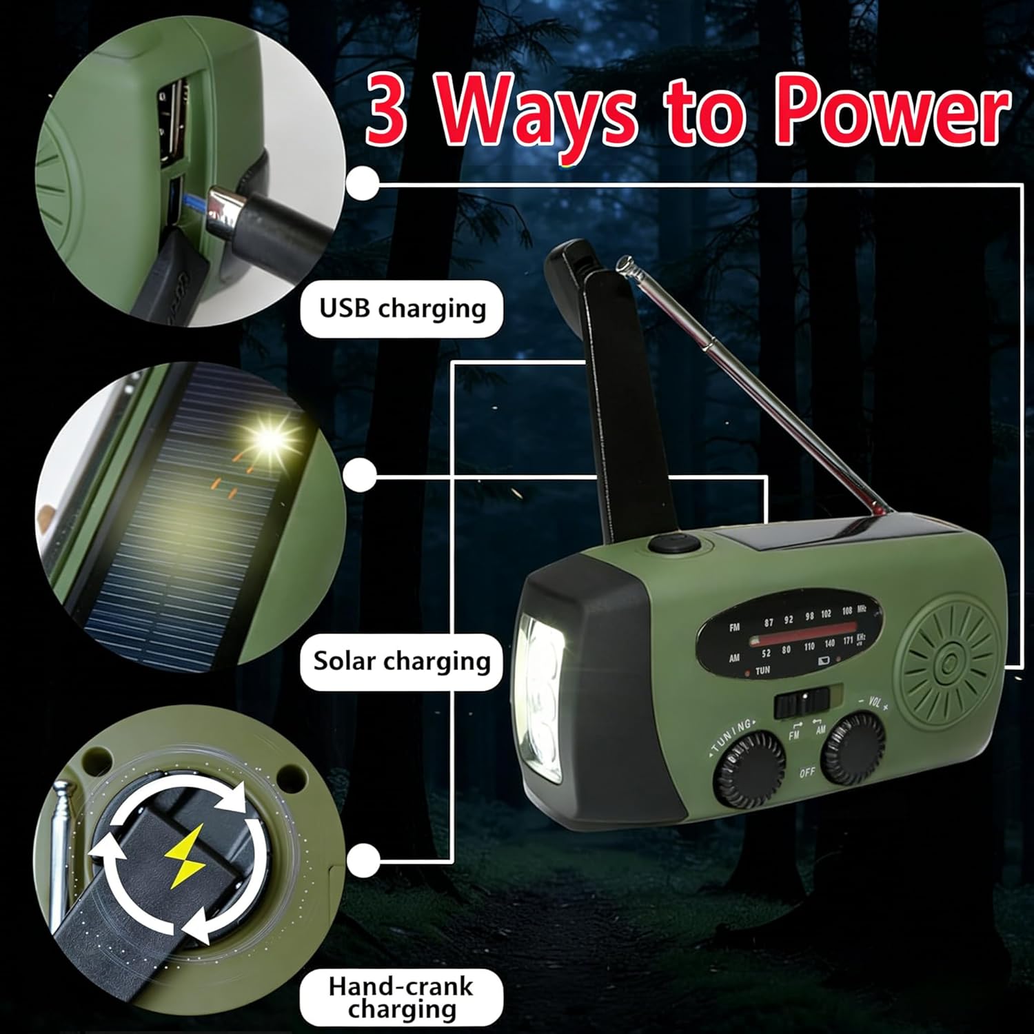 - Multiple charging methods (solar, hand crank, Type-C)