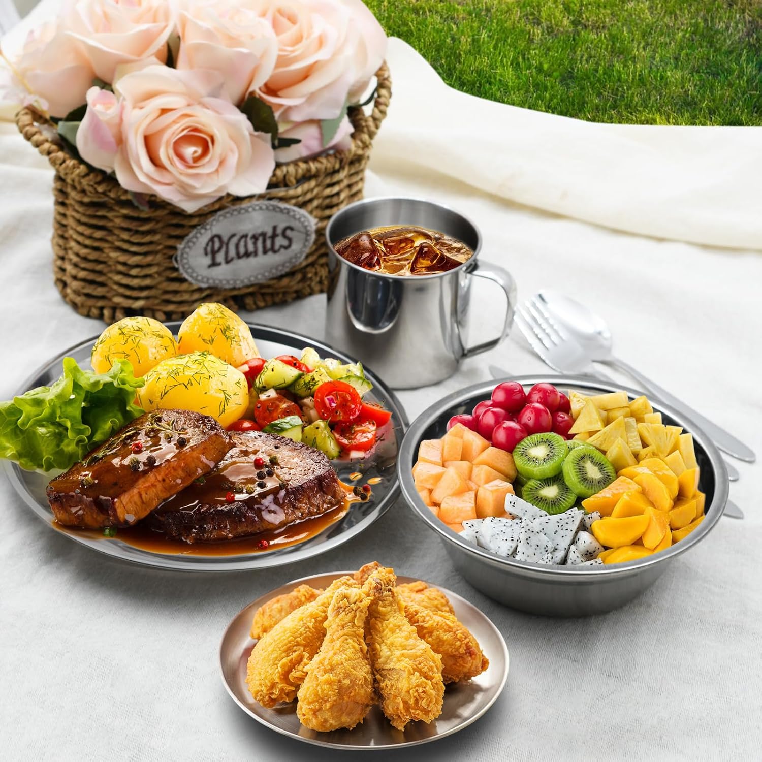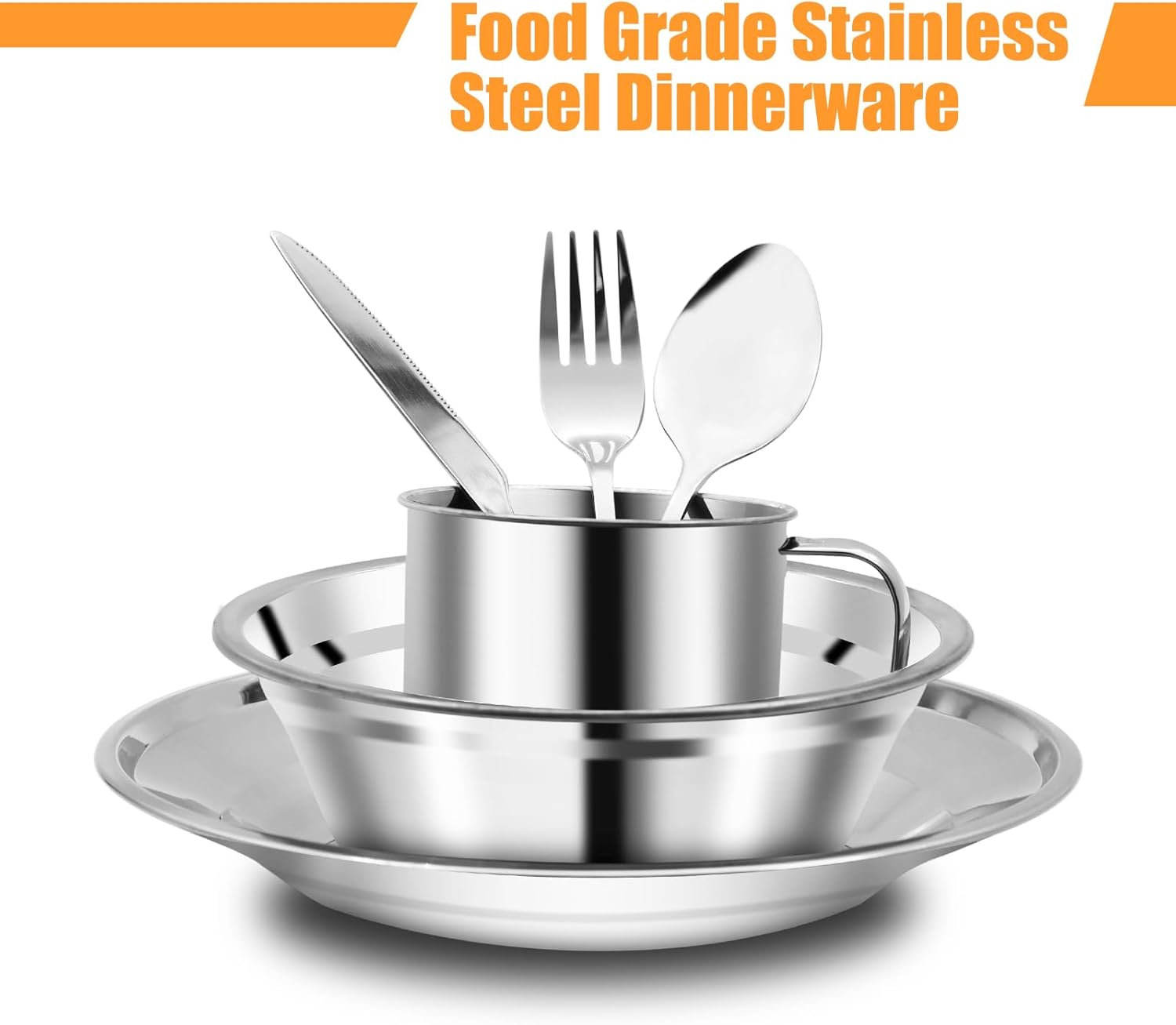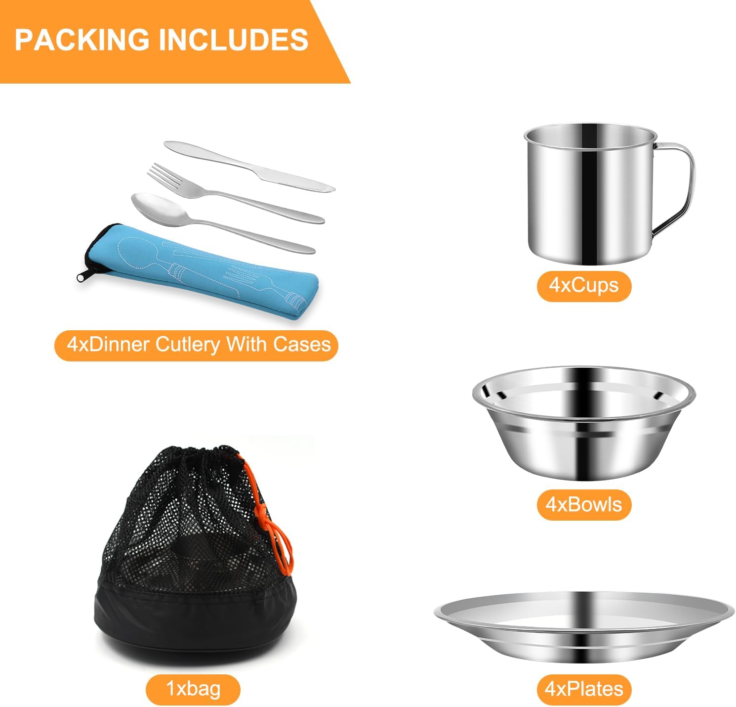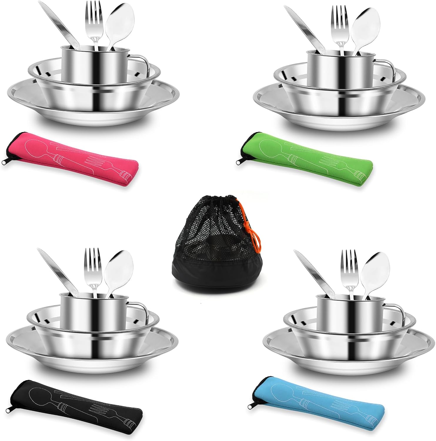 29 Pcs Stainless Steel Cutlery Set with Bowls, Plates, Cups, Forks, Spoons and Knives for 4 People. Travel Cutlery Set for Backpacking, Outdoor Camping, Hiking and Picnic