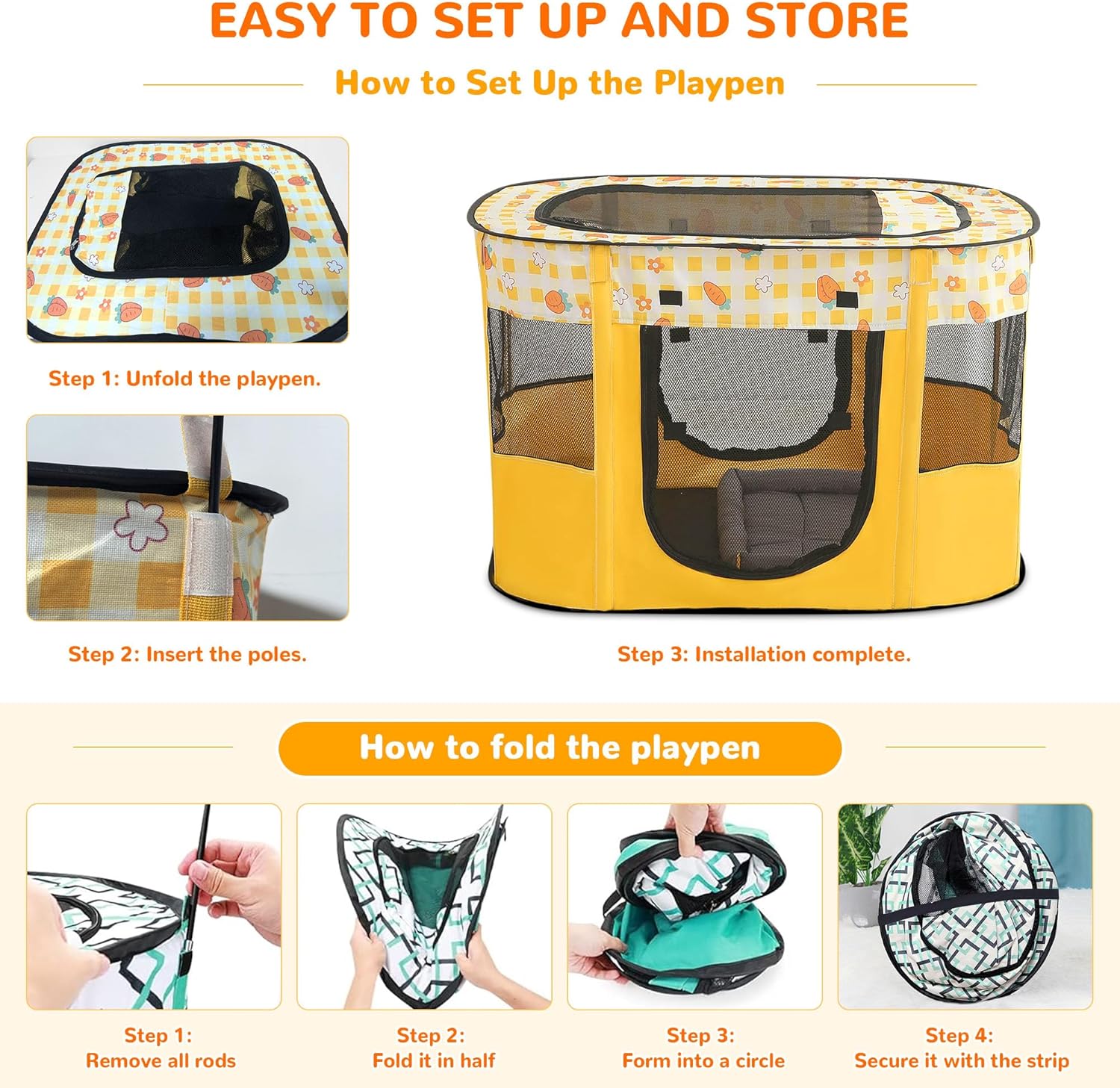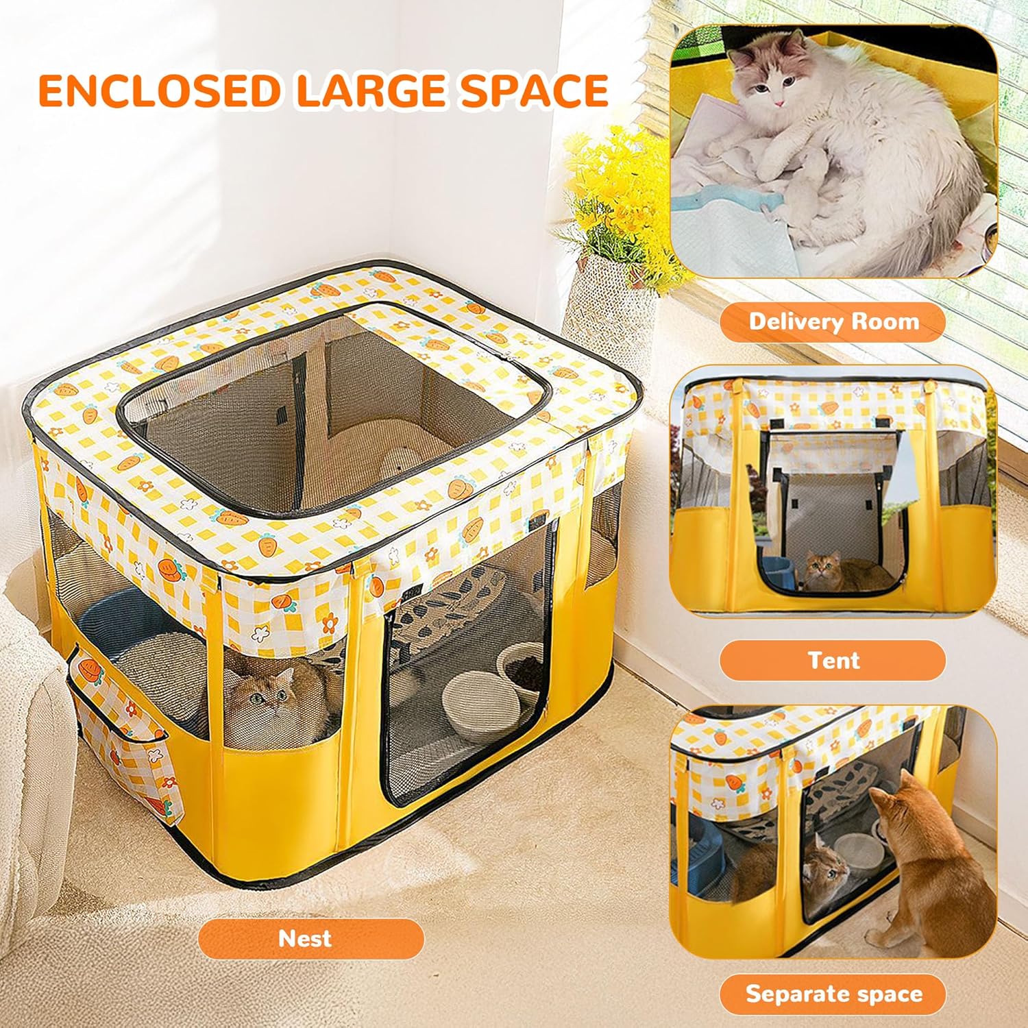 ALLSOPETS Cat Playpen for Dog, Foldable Pet Play Pen for Indoor Outdoor Use, Portable Dog Cat Crate Tent for Puppies Kittens, Pop-Up Pet Cage for Travel Camping (Yellow Carrots, M)