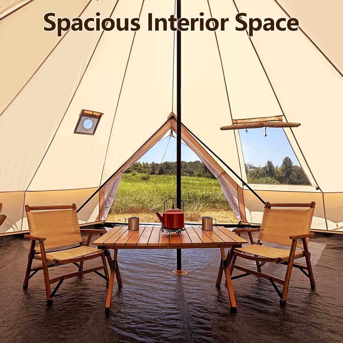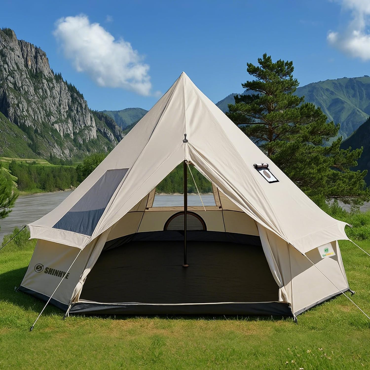 The Bell Yurt Tent is designed for year-round camping, featuring waterproof 420D Oxford cloth that outperforms traditional canvas. This tent is equipped with air conditioning vents for hot weather and two PVC skylights for natural light and stargazing. The non-removable floor adds to its durability and ease of setup.