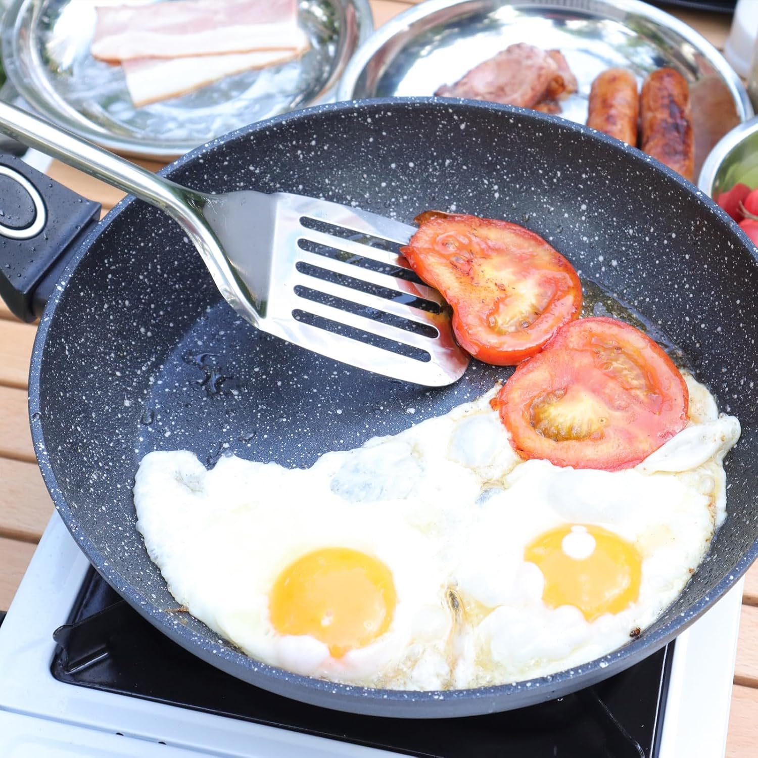 The utensils are typically made from durable, heat-resistant materials suitable for outdoor cooking.