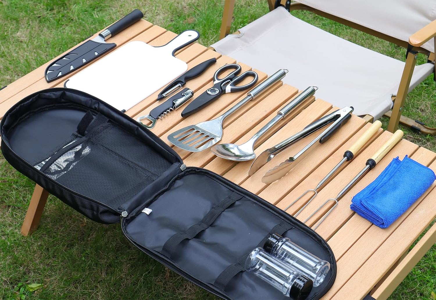 The Camping Cooking Set includes 14 pieces of portable outdoor kitchen accessories.