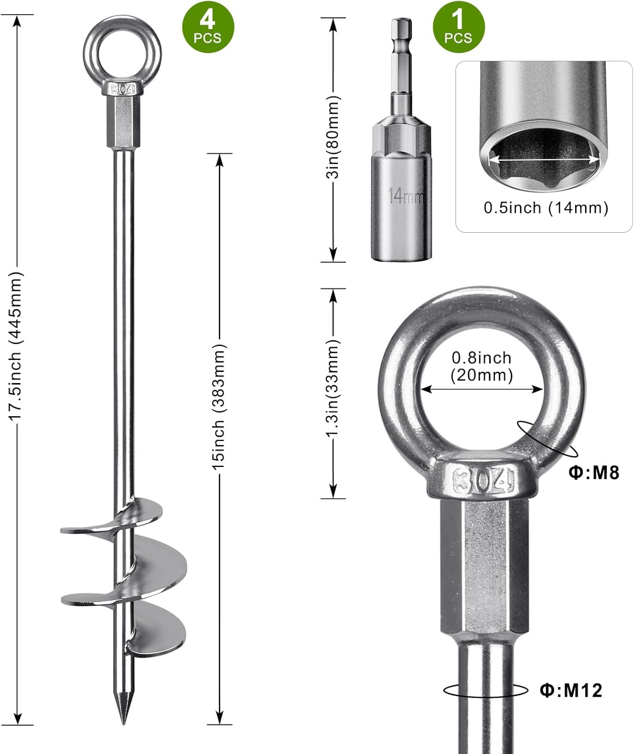 Dolibest Tent Peg Heavy Duty, 46cm Ground Anchor Screw Trampoline Stake Metal Earth Sand Spiral Wind Storm Spike for Swing/Camping/Shed/Dog/Carport/Canopy with Fixed Eyelet, 4 Pack