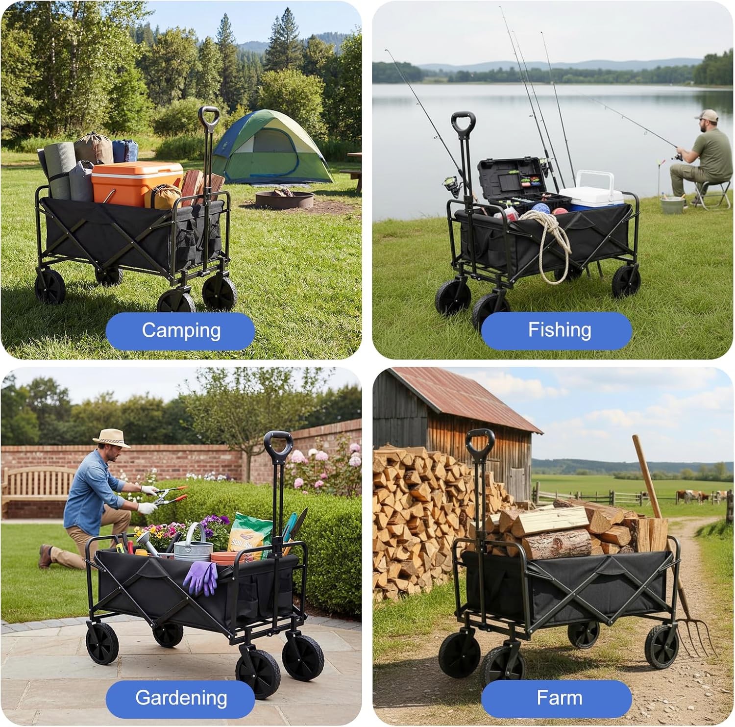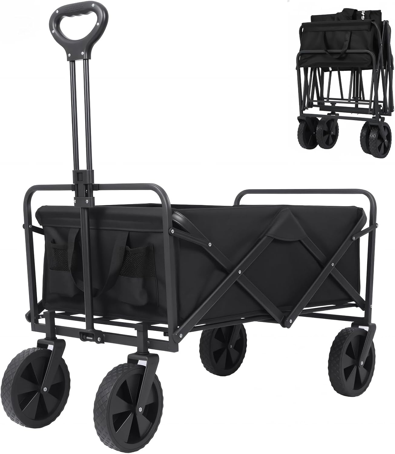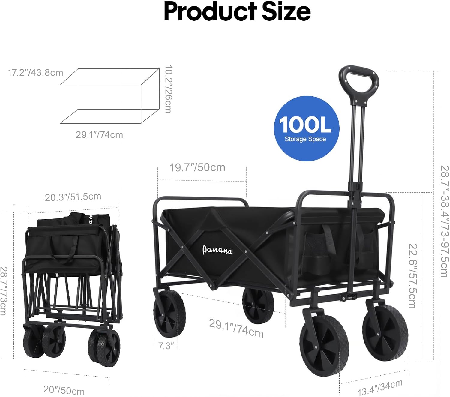 Folding Trolley Utility Wagon Cart with All-Terrain Wheels, 100L Storage Capacity, Heavy-Duty Steel Frame,Garden Wagon Cart 150kg Load Capacity (Black)