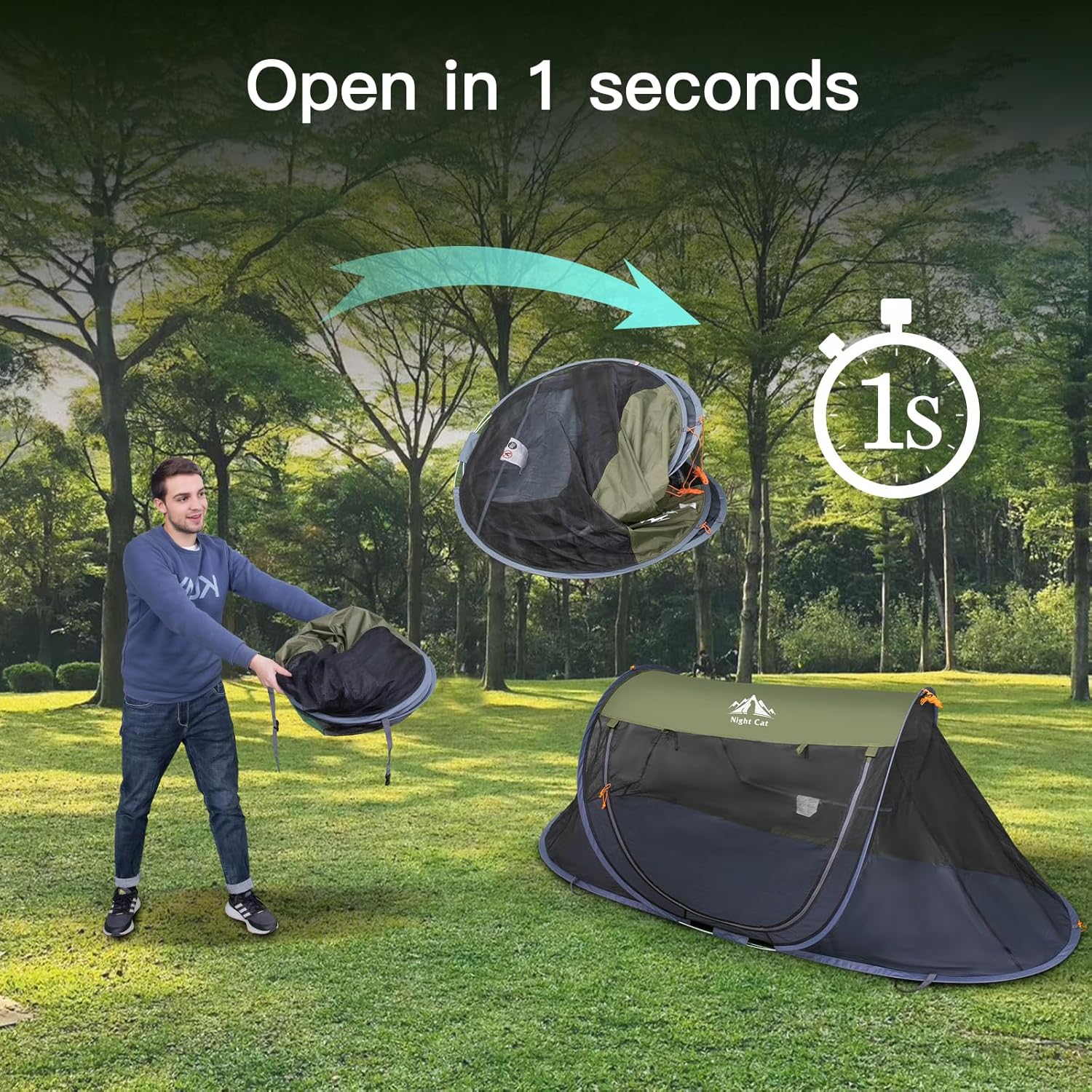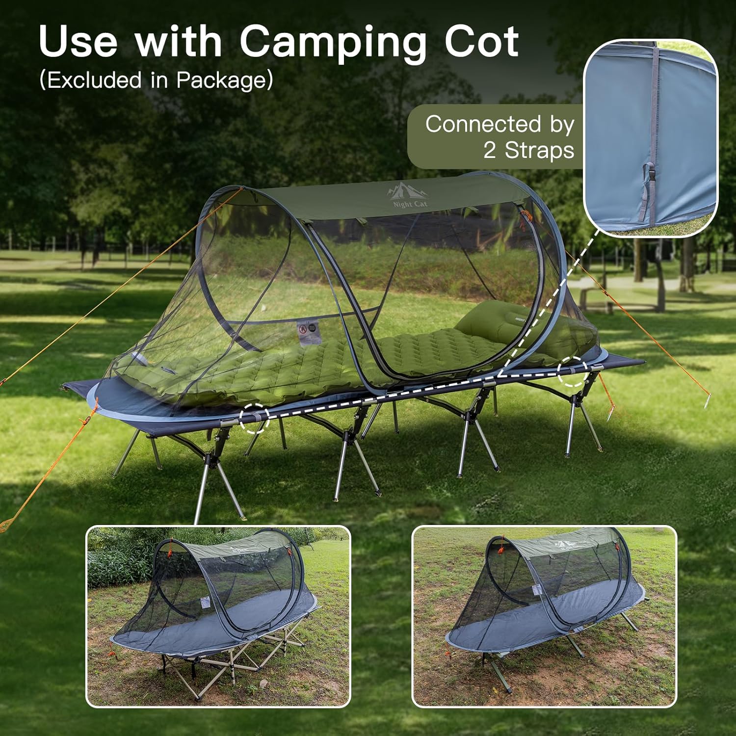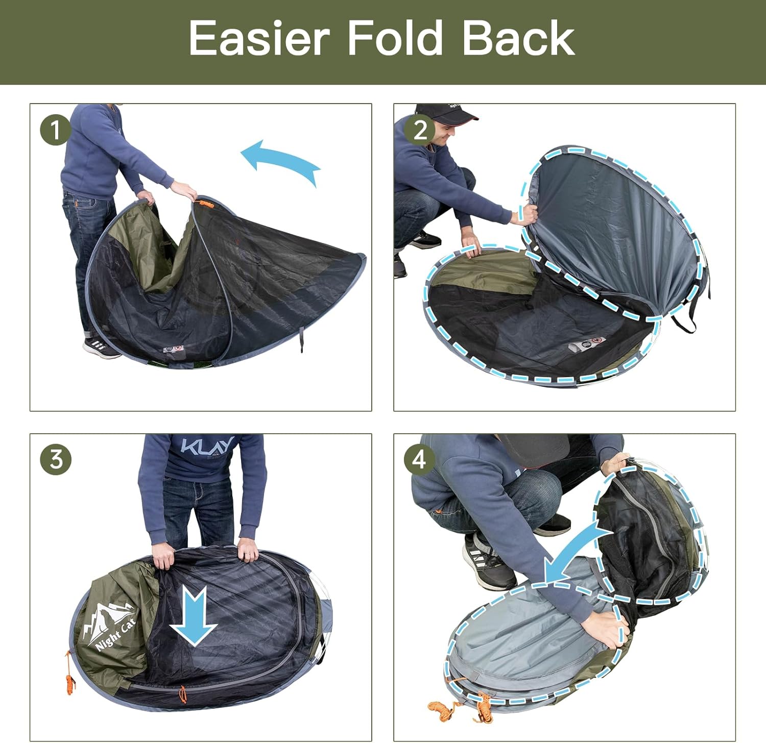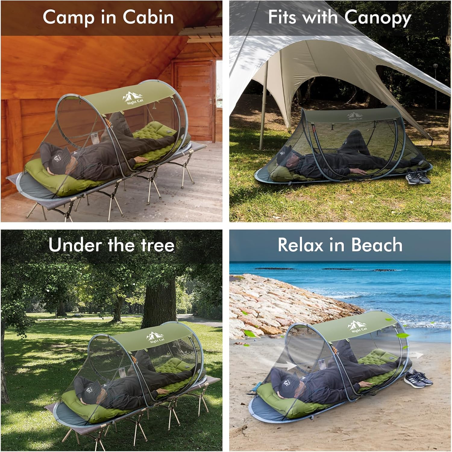 The Night Cat Mosquito Pop Up Tent is designed for easy setup and convenience. It opens instantly in just 3 seconds, making it perfect for quick outings. The upgraded folding method simplifies packing, allowing you to fold it like an "8" for easy storage. This tent features a strong mesh net that keeps bugs away while allowing air to flow, making it ideal for summer use at picnics, festivals, or in your backyard.