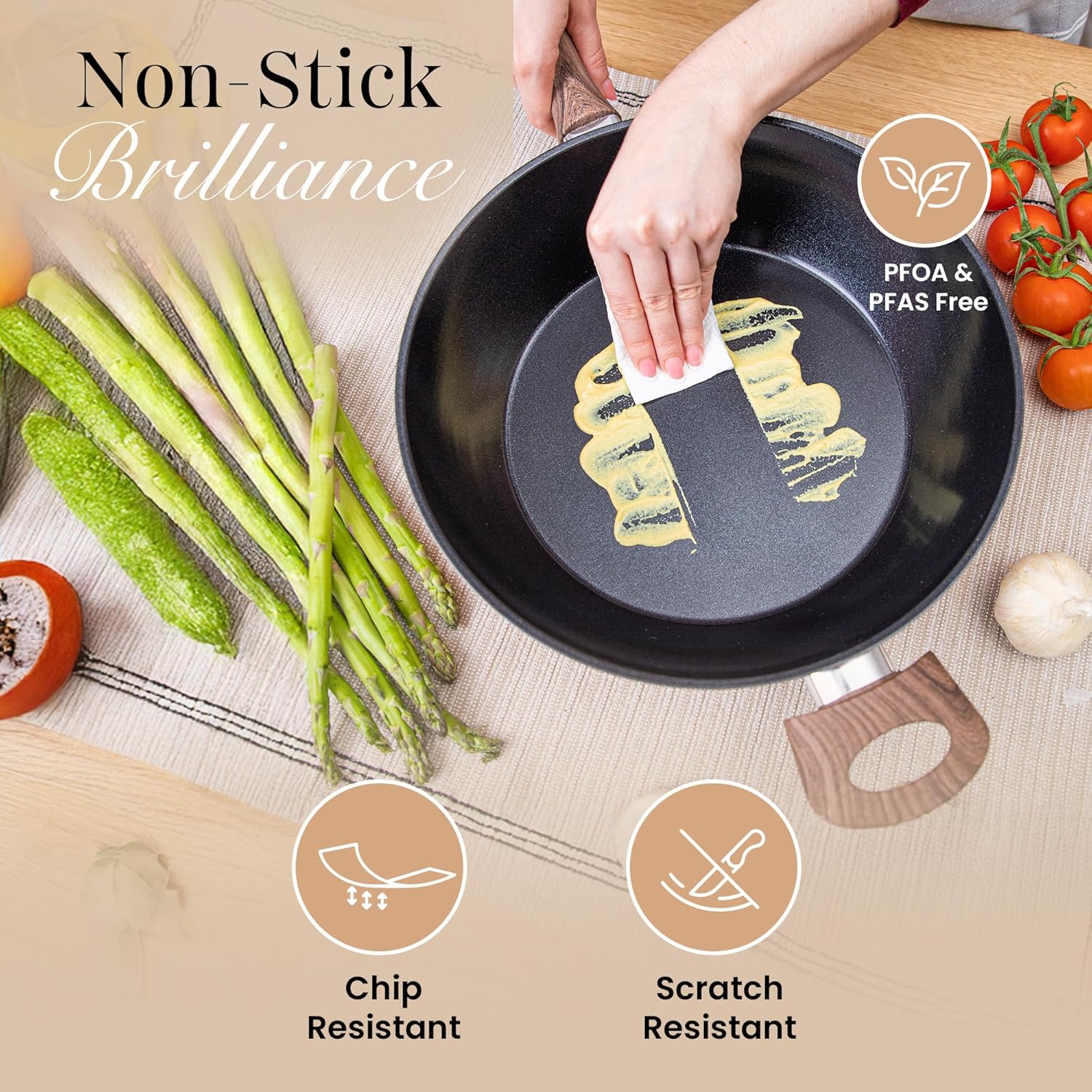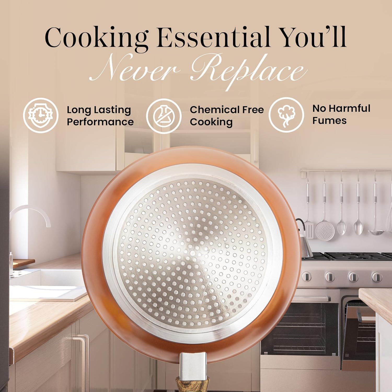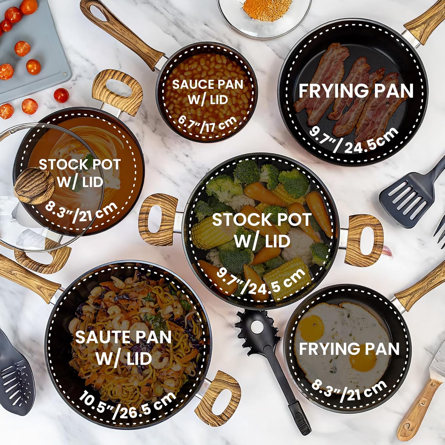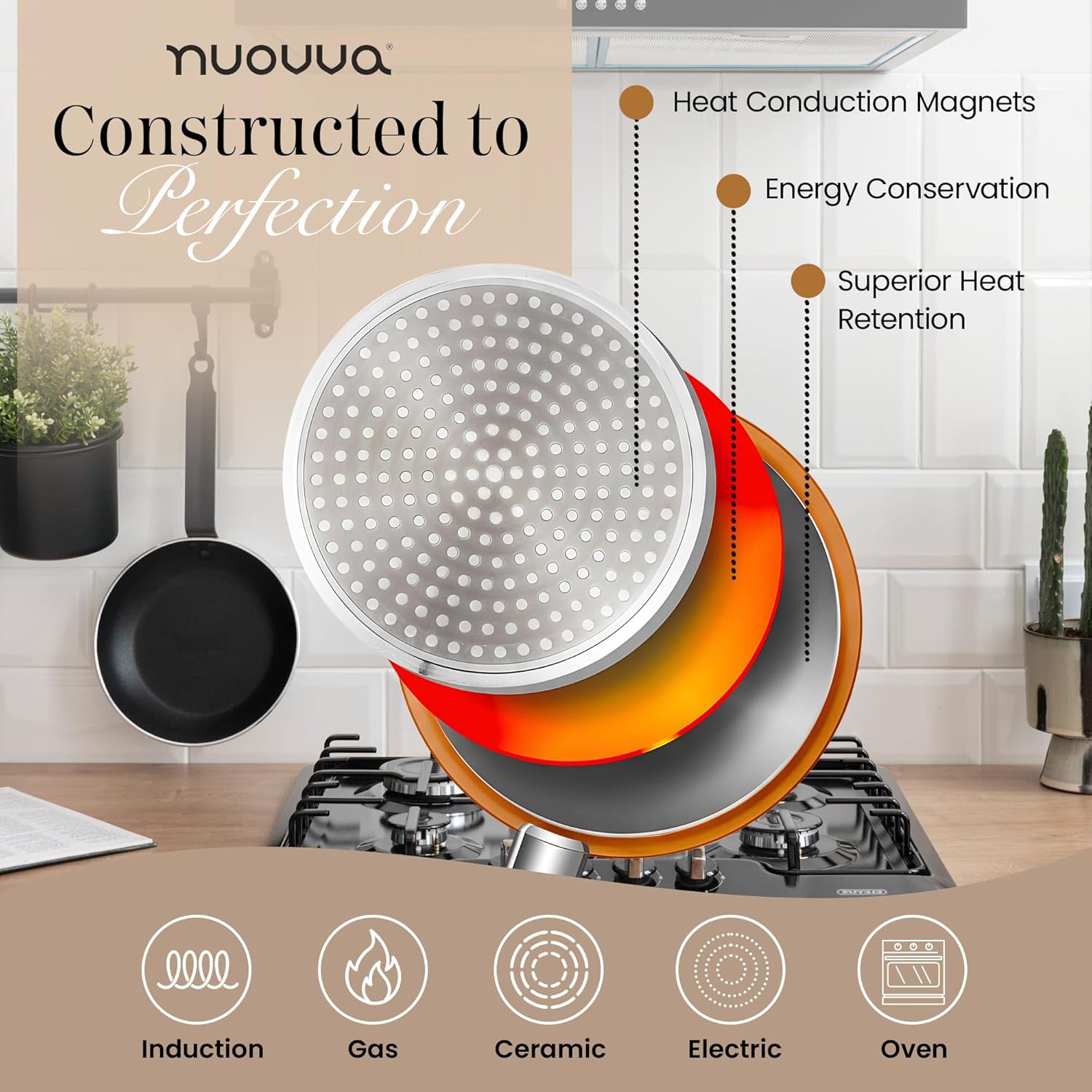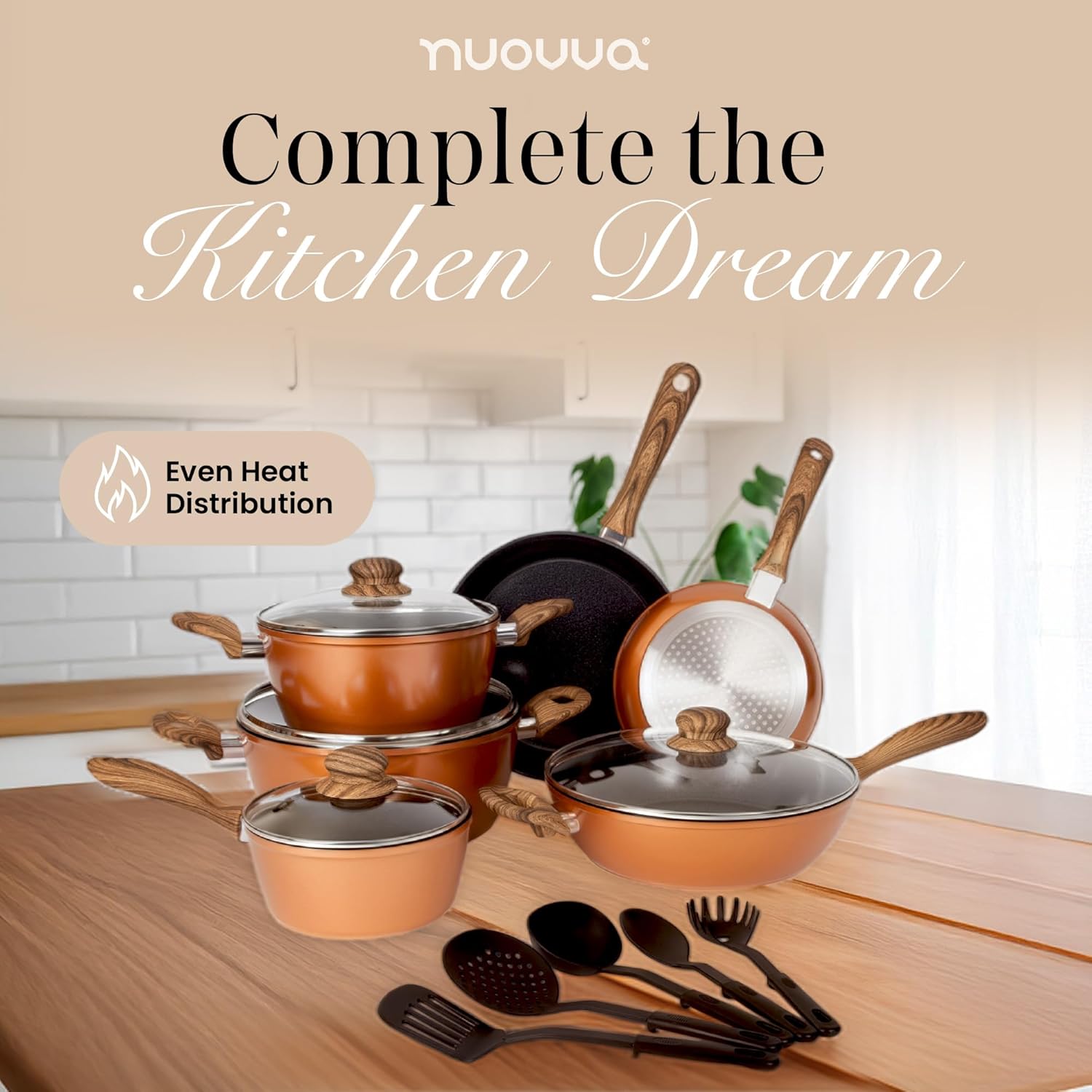 Discover the convenience of cooking with Nuovva's Non Stick Pots and Pans Set. This 15-piece cookware collection is designed to make meal preparation easier and more enjoyable. The copper construction ensures quick heating and even cooking, while the non-stick surface allows for healthier meals without added fats or oils. Cleanup is a breeze as food slides off effortlessly.