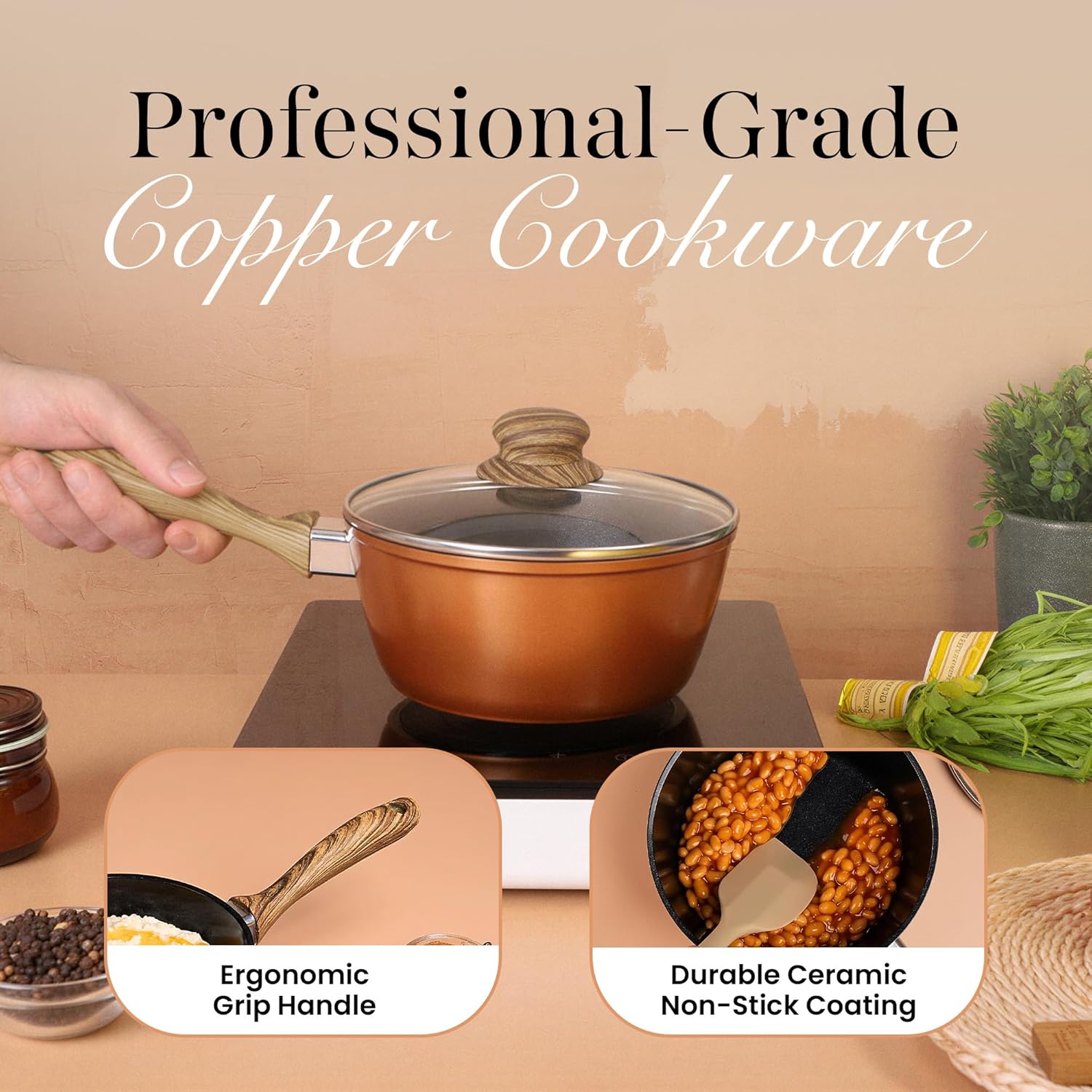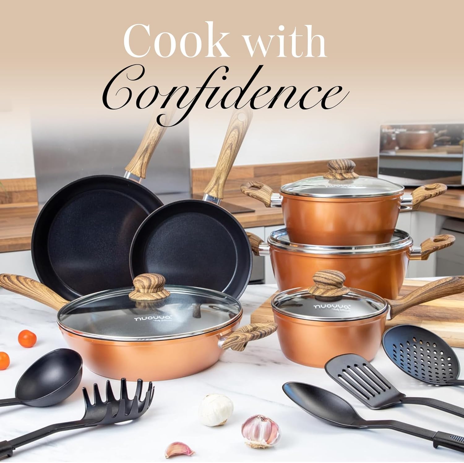 Non Stick Pots and Pans Set – Induction Hob Pots Set – 15pcs Kitchen Cookware with Lids – Cooking Copper Saucepan Pots – by Nuovva