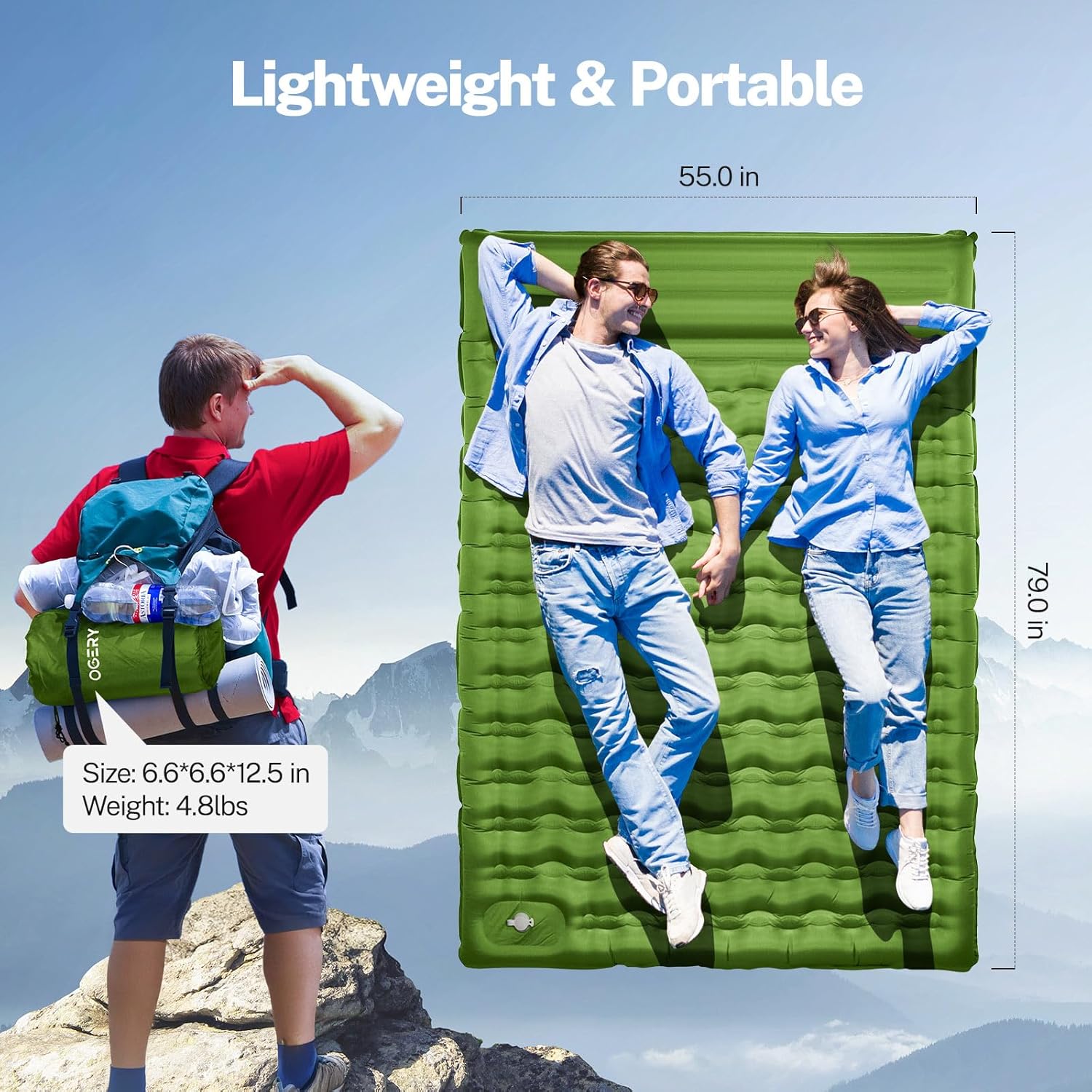 The OGERY Camping Mat is designed for outdoor enthusiasts seeking comfort during their camping trips. This 15cm extra-thick sleeping pad features reinforced construction, ensuring durability and support. It includes built-in pillows for added convenience and a foot pump for easy inflation, eliminating the need for additional equipment.
