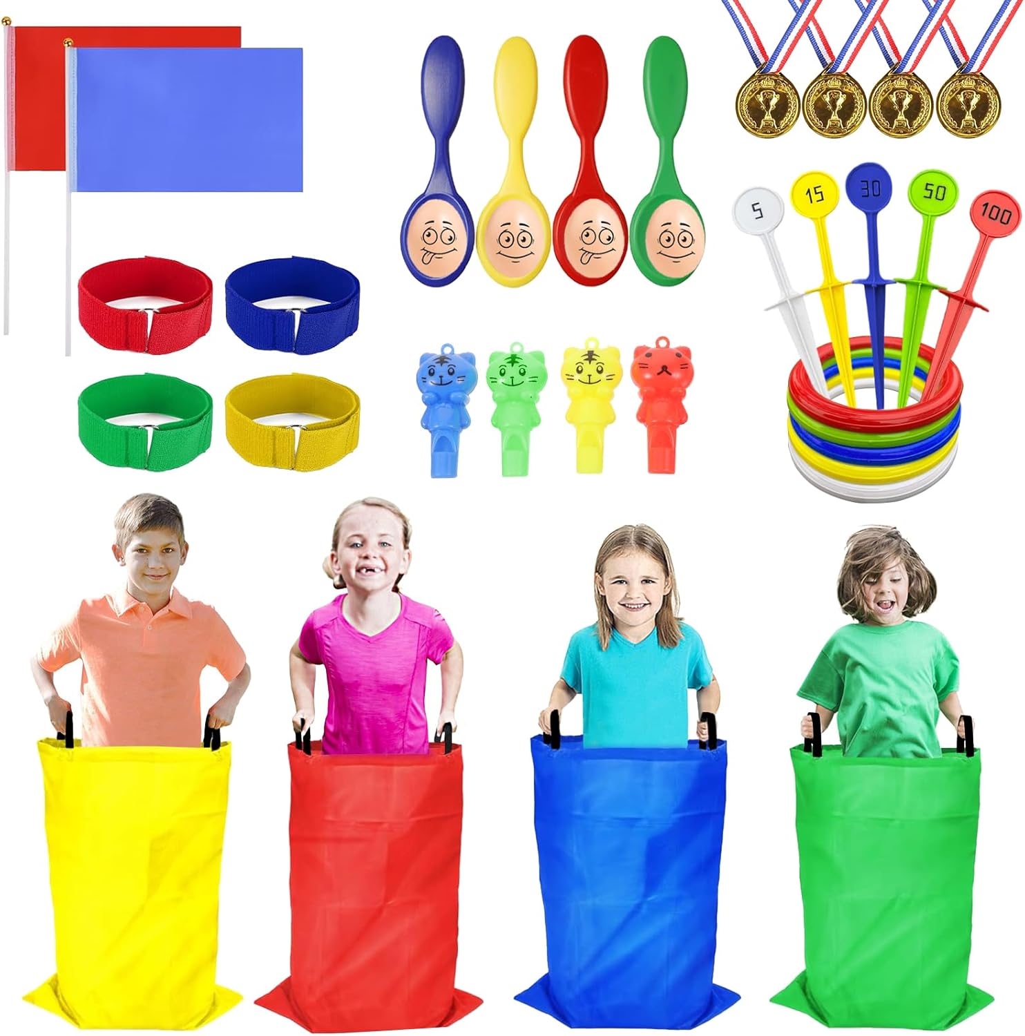 Sports Day Kit, 36 Pcs Outdoor Games Set, Sack Race, Ring Toss Game, Egg and Spoon Race, 3 Legged Race, Medal and Whistles, Birthday Party Games Backyard Garden Game Kit for Kids and Family