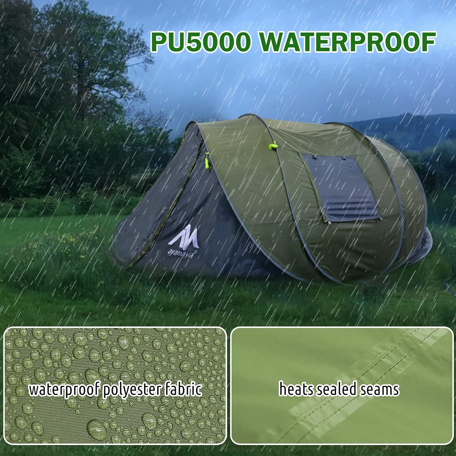 The tent features an instant pop-up design with pre-assembled poles, allowing for setup in just seconds.