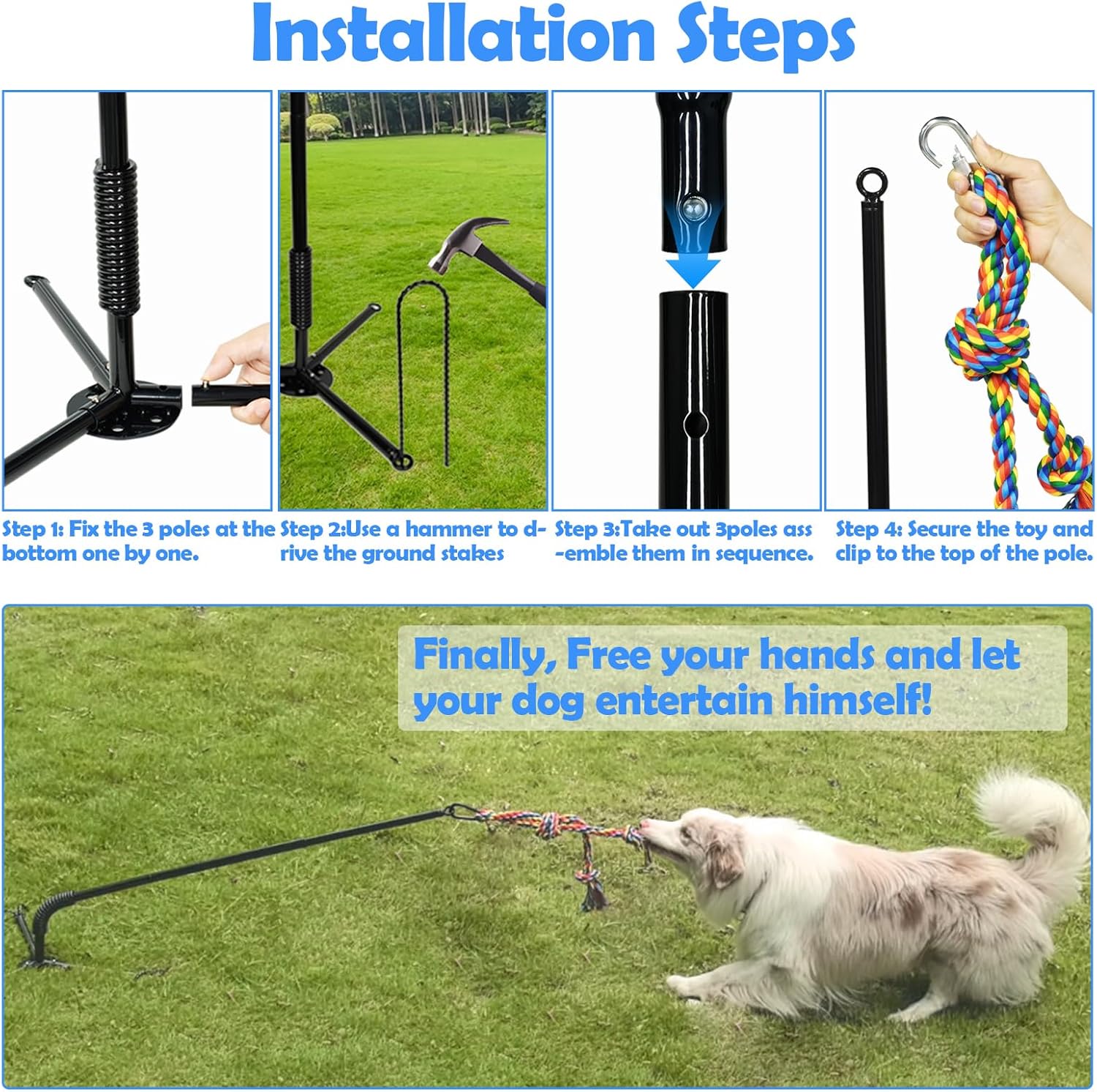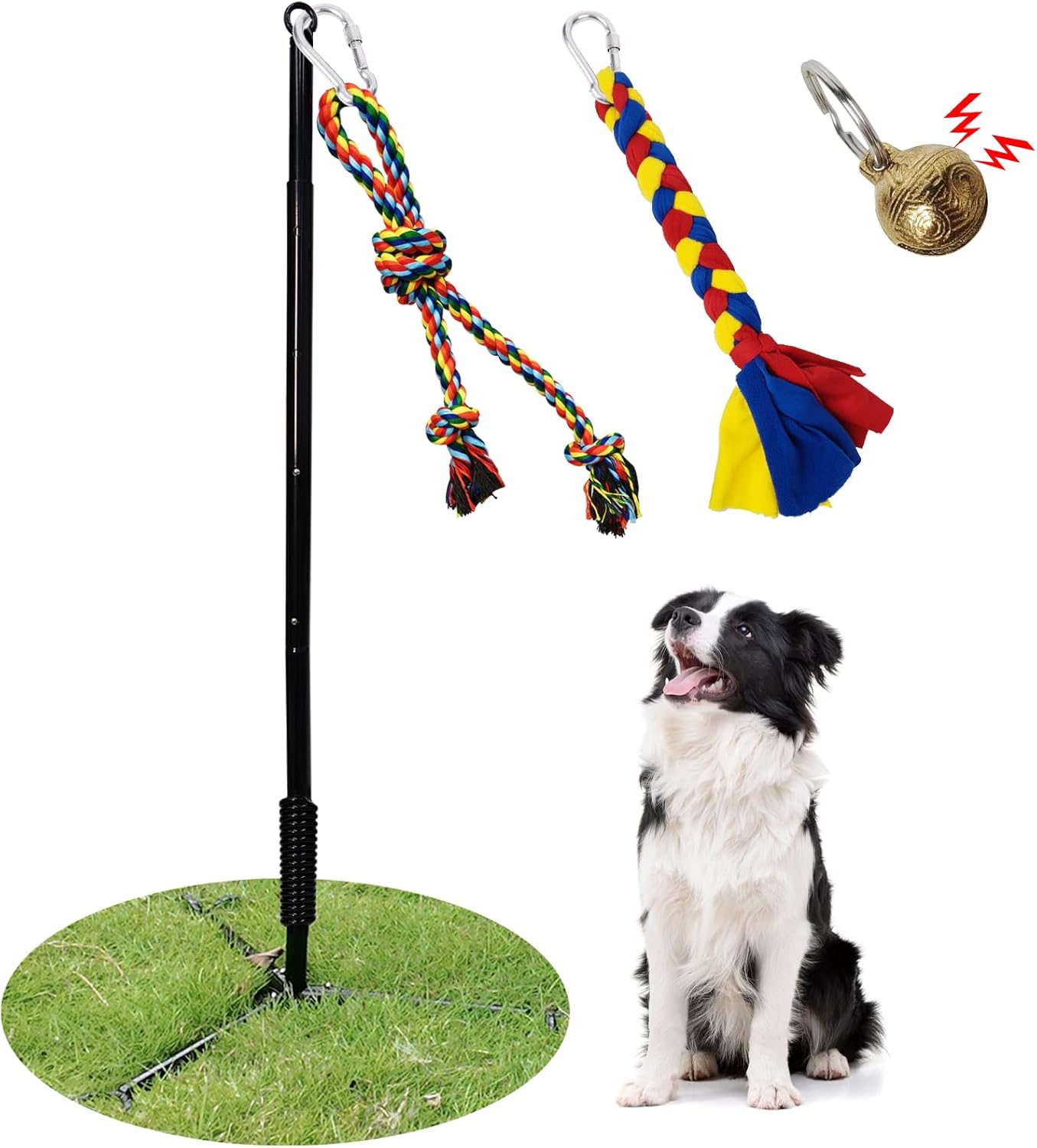 Tether Outdoor Dog Toy,Interactive Exercise Game in Yard Park Tug of War for Large Medium Small Dog Puppy with 2 Rope Toy and Bell Pull Chase and Solo Play
