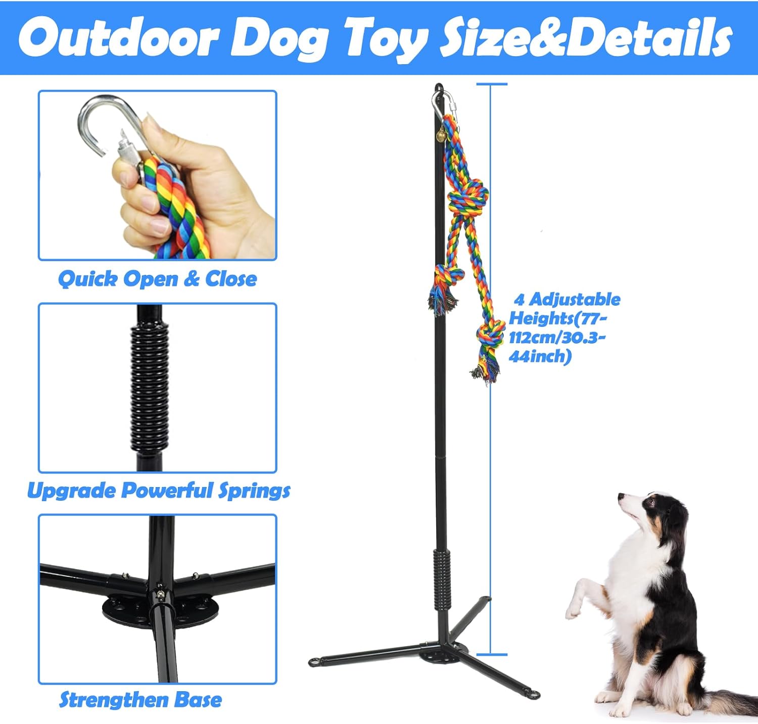 The Tether Outdoor Dog Toy is designed for interactive play, making it an excellent choice for keeping your dog engaged and active. This toy is made from durable materials including metal and cotton, ensuring it withstands vigorous play. The adjustable pole extends from 29.5 to 43 inches, accommodating dogs of various sizes, from small breeds like Beagles to larger breeds like Labs. With features such as a built-in spring and a stable three-legged base, it provides a secure and balanced play experience. The package includes two rope toys, a bell, and ground stakes for easy setup.