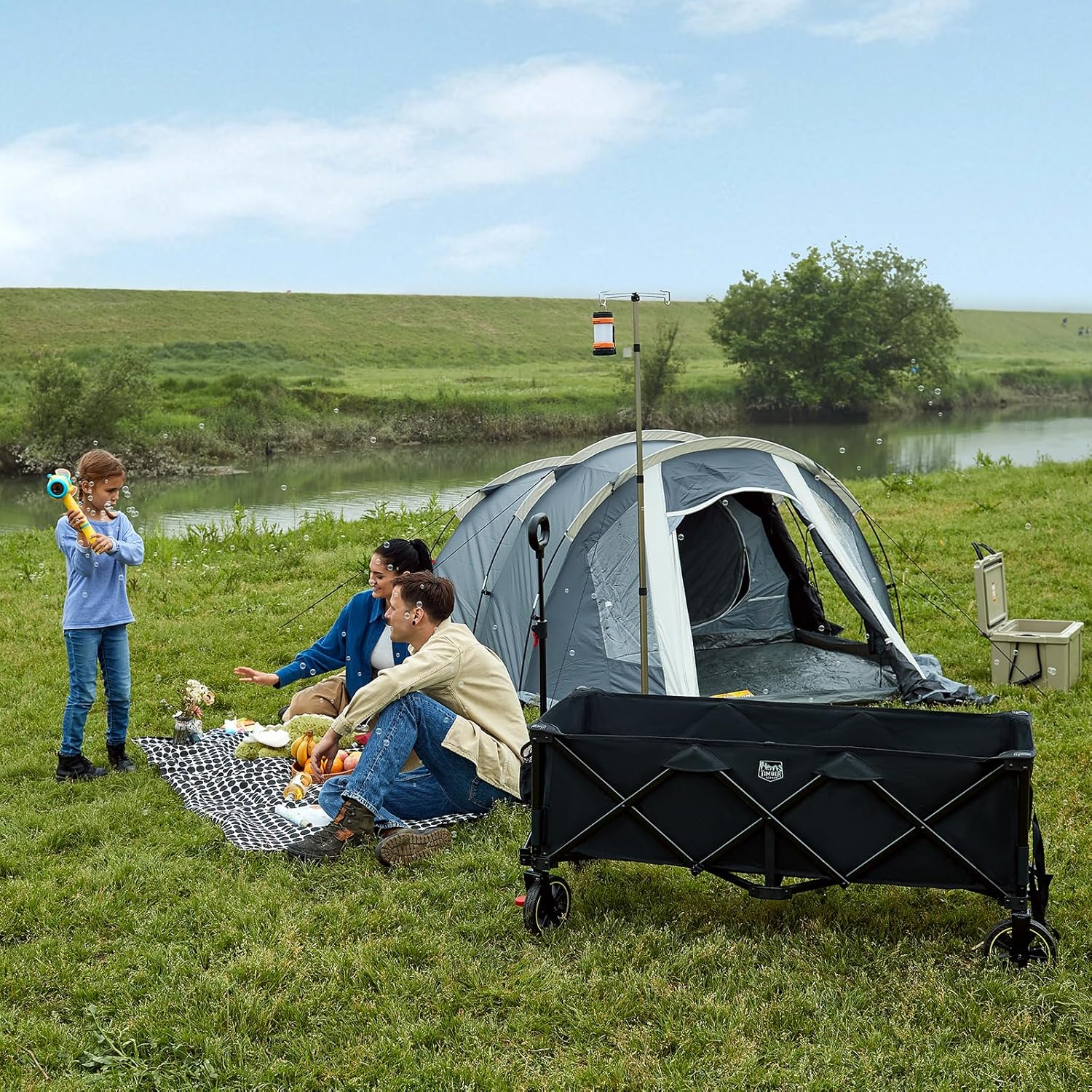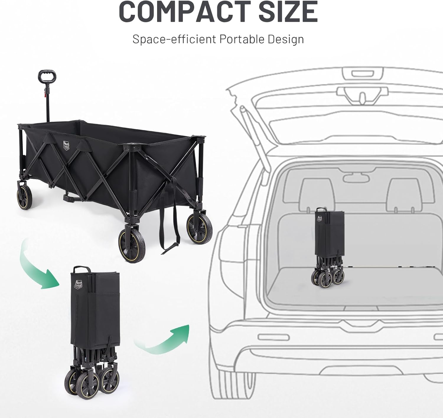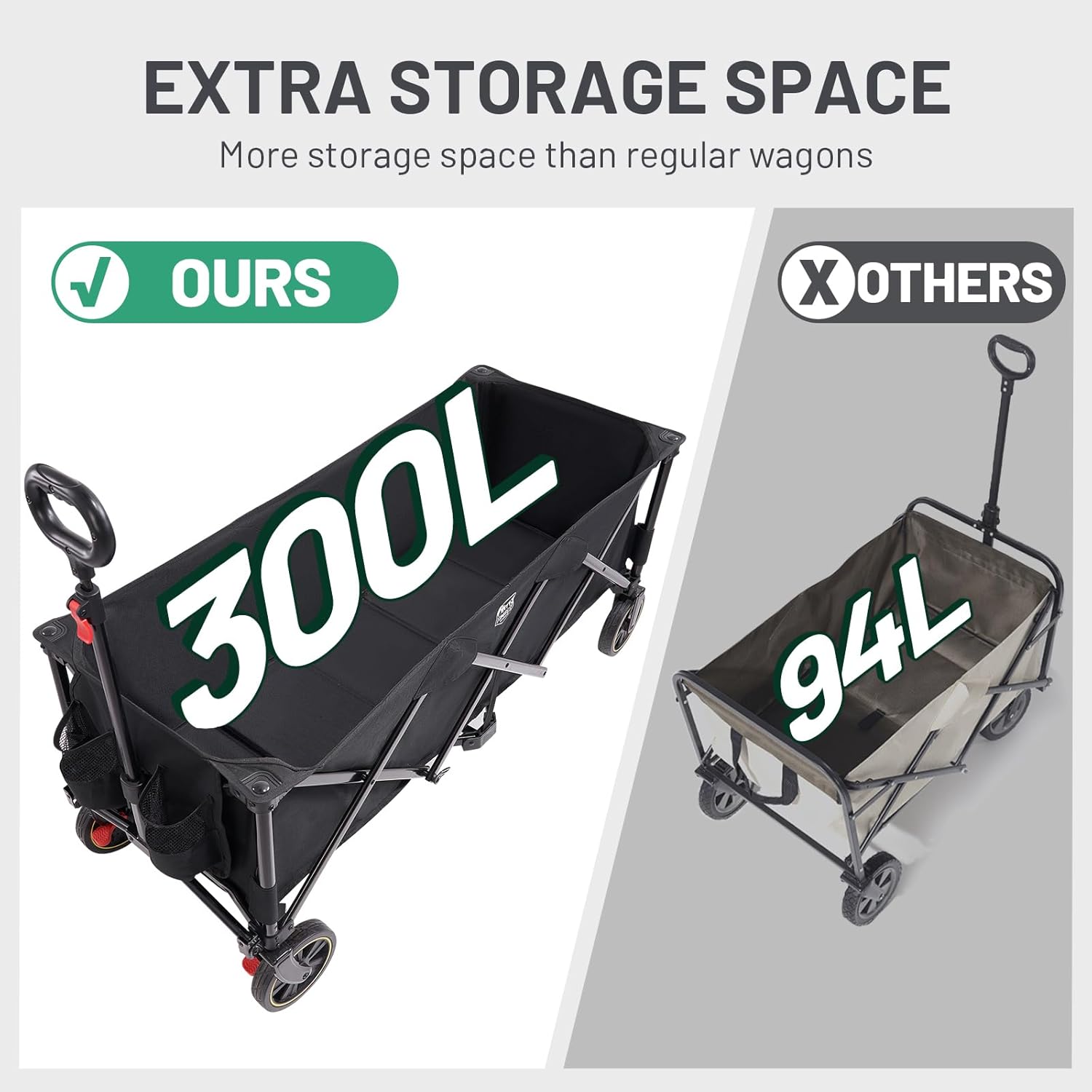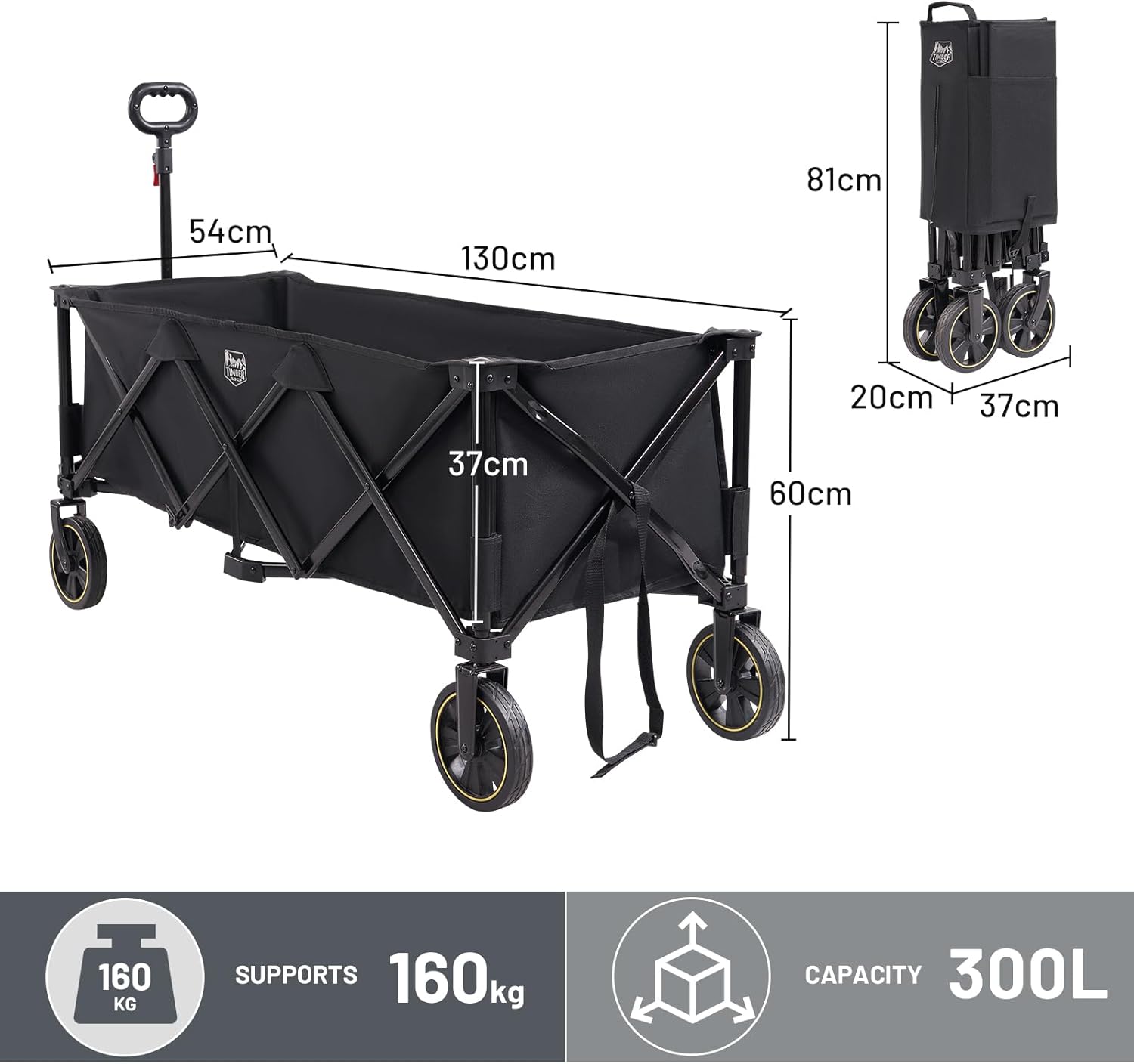 TIMBER RIDGE Extended Festival Trolley with Brakes & Cargo Net, 300L Large Folding Trolley on Wheels with Adjustable Handle & Cup Holder, 160kg Heavy Duty Wagon Cart for Camping Shopping Hiking, Black