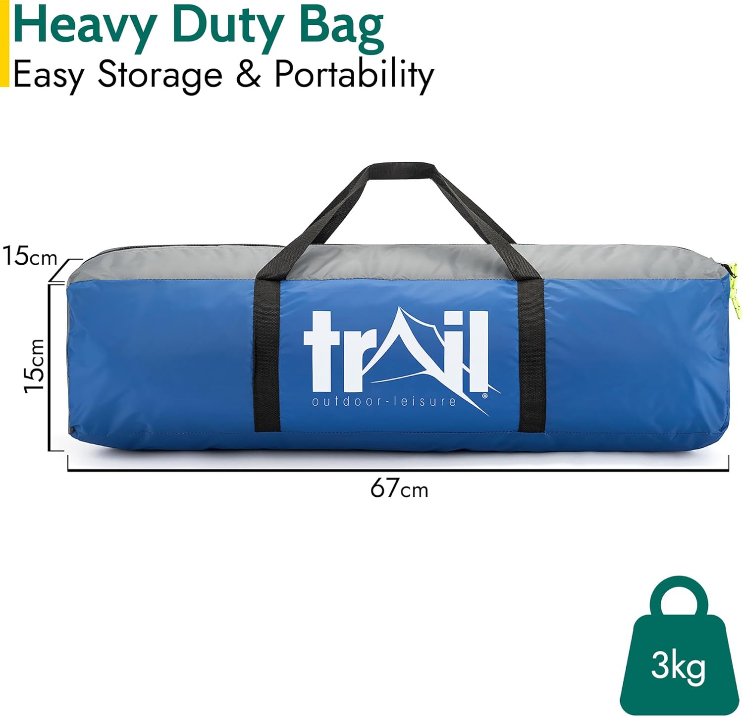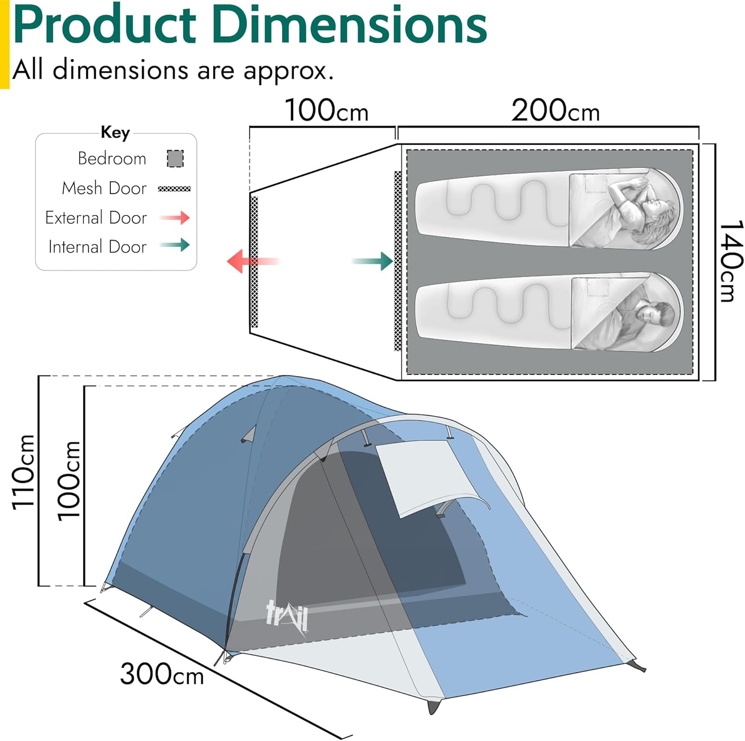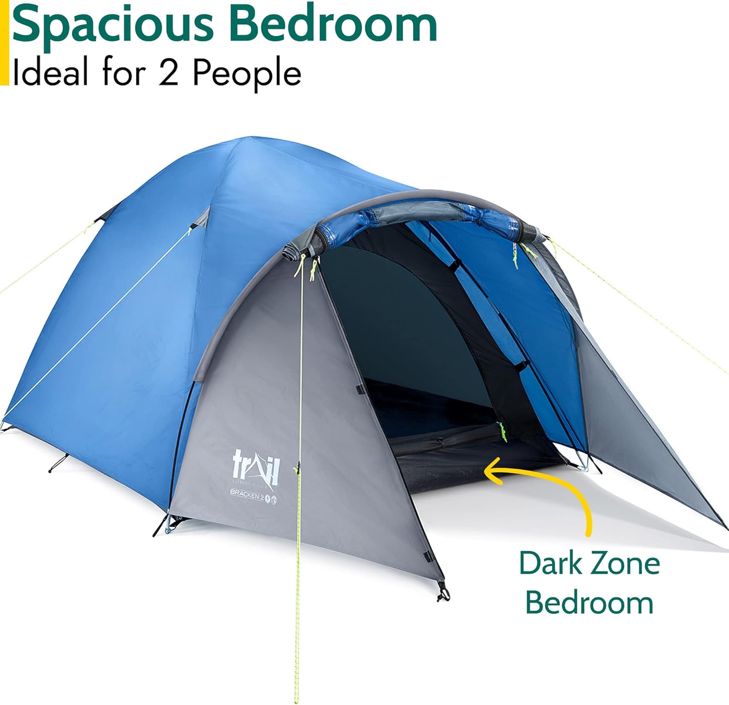 Trail Bracken Tent With Porch, 3000mm Waterproof Rating, Double Skin Dome Tent with Darkened Bedroom, Lightweight for Camping and Festivals, Bag Included (2 Person / 3 Person / 4 Person)
