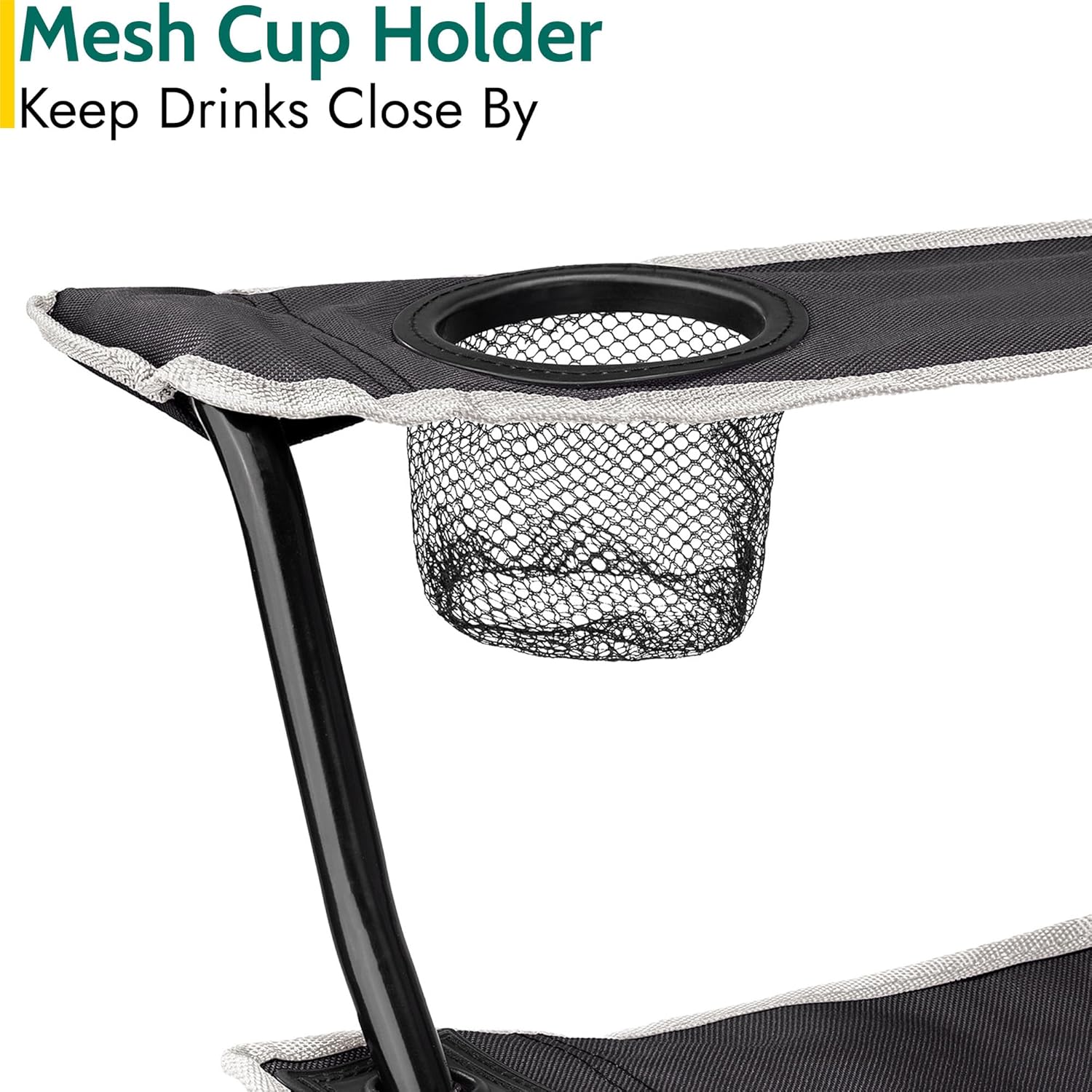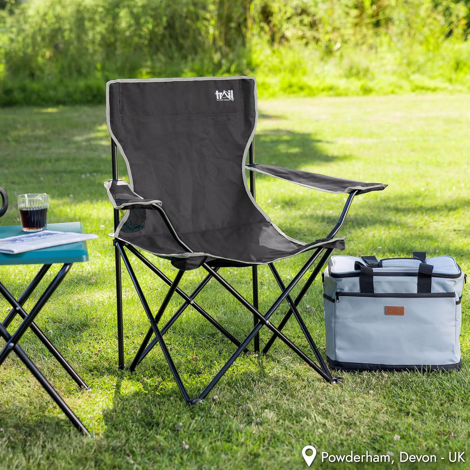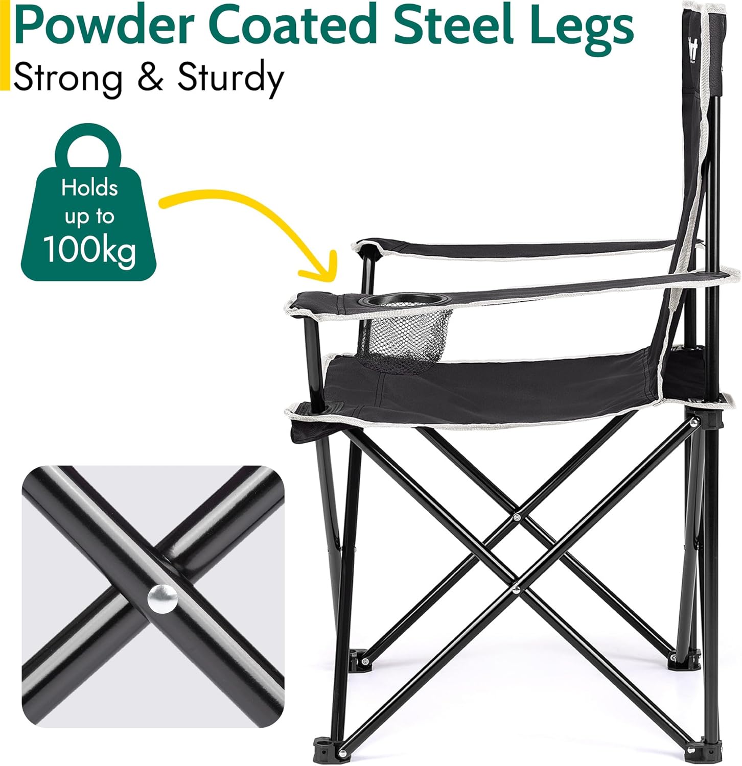 Trail Folding Camping Chair, Lightweight Outdoor Chair with Cup Holder Armrest, Heavy Duty Tubular Steel Frame, Fast-Drying Polyester, Carry Bag, 100kg Capacity (Black)