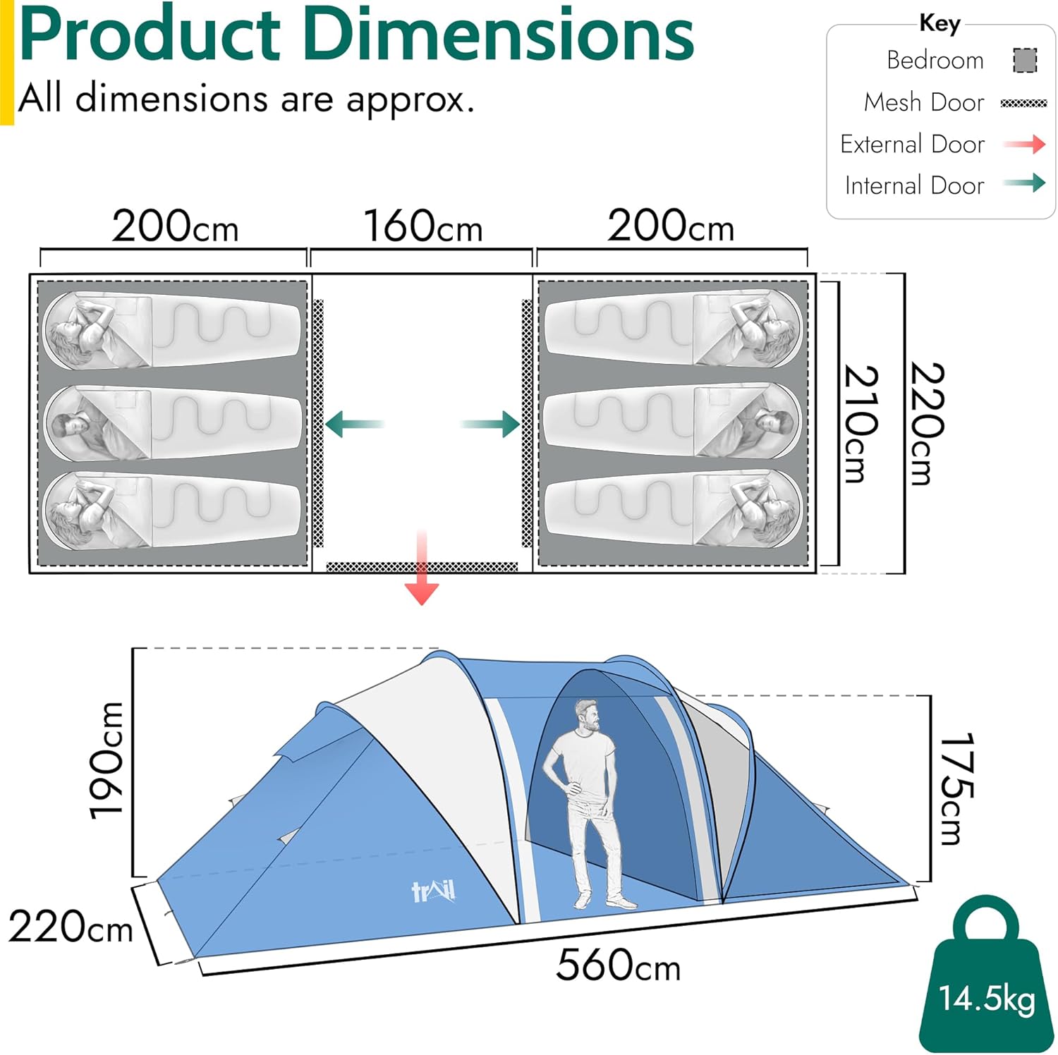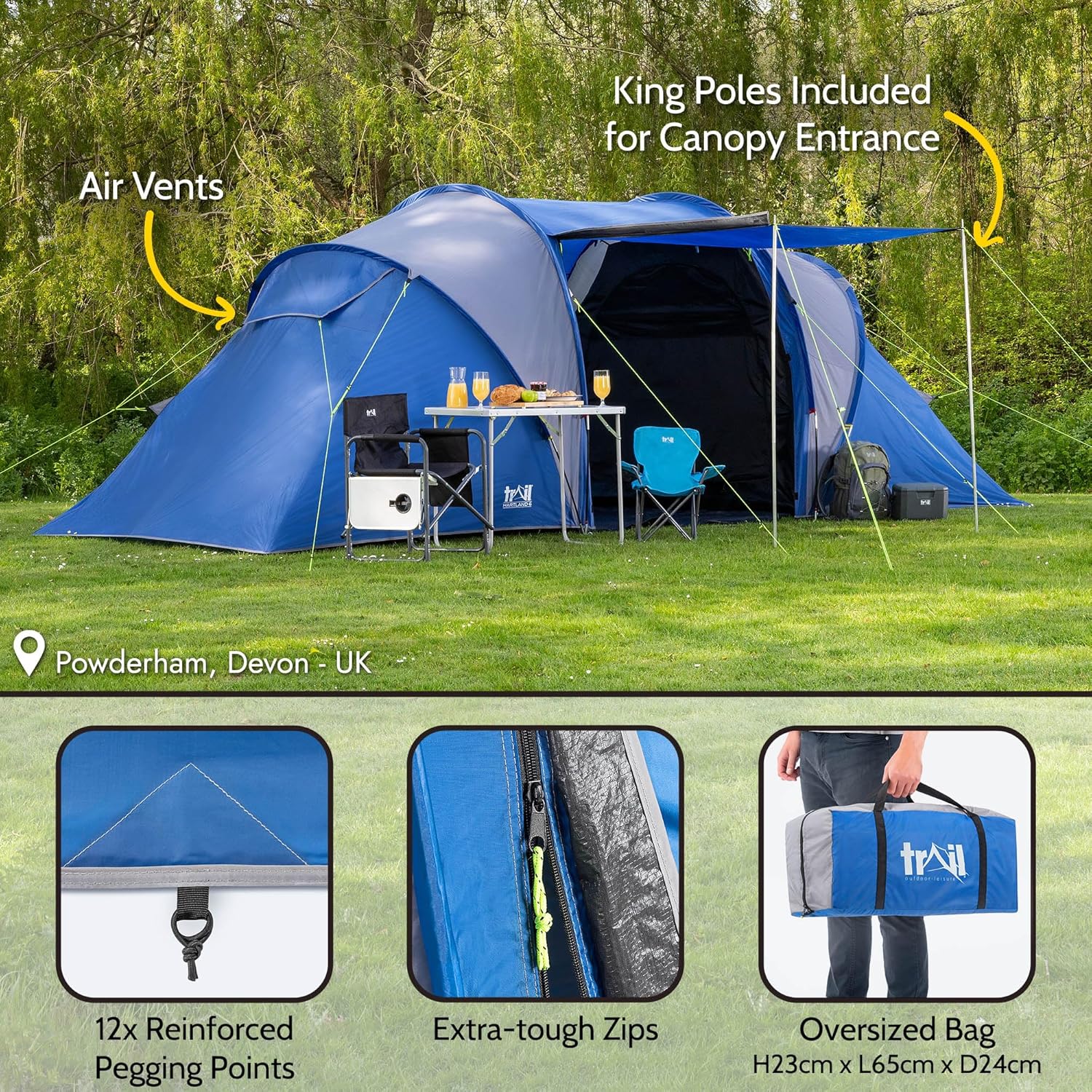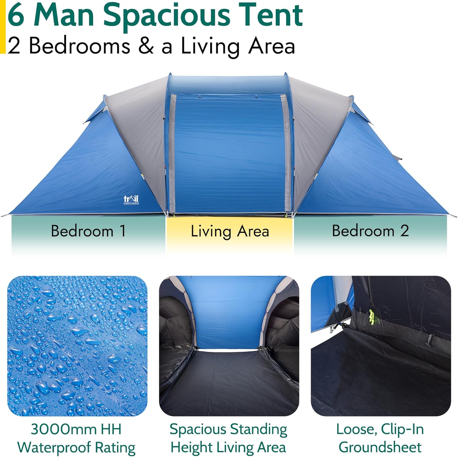 Trail Hartland XL 6 Man 2 Room Tent with Living Area, 3000mm HH Waterproof Rated, 2 Darkened Bedrooms, Easy Pitch Family Camping Tunnel Tent, King Pole Awning, Storage Bag, L560cm x W220cm x H190cm