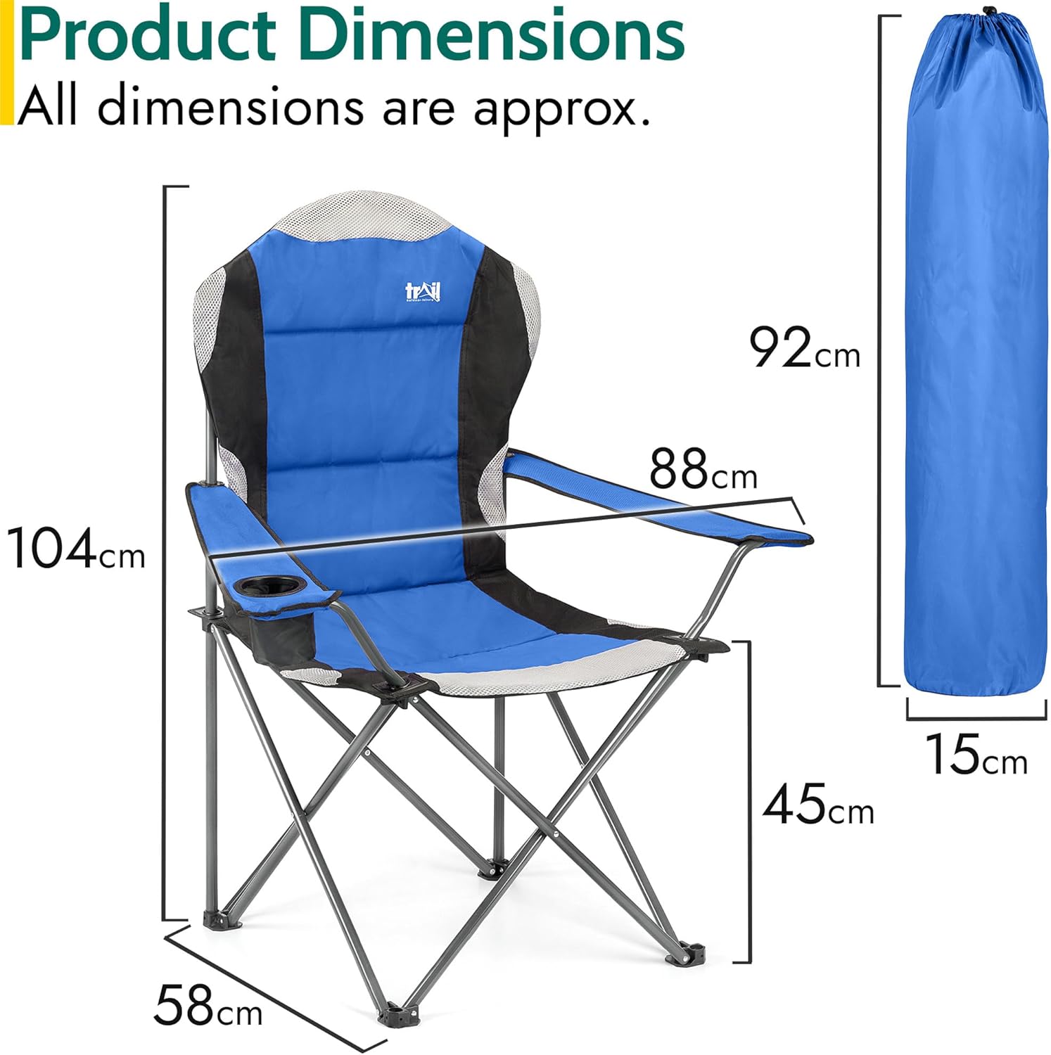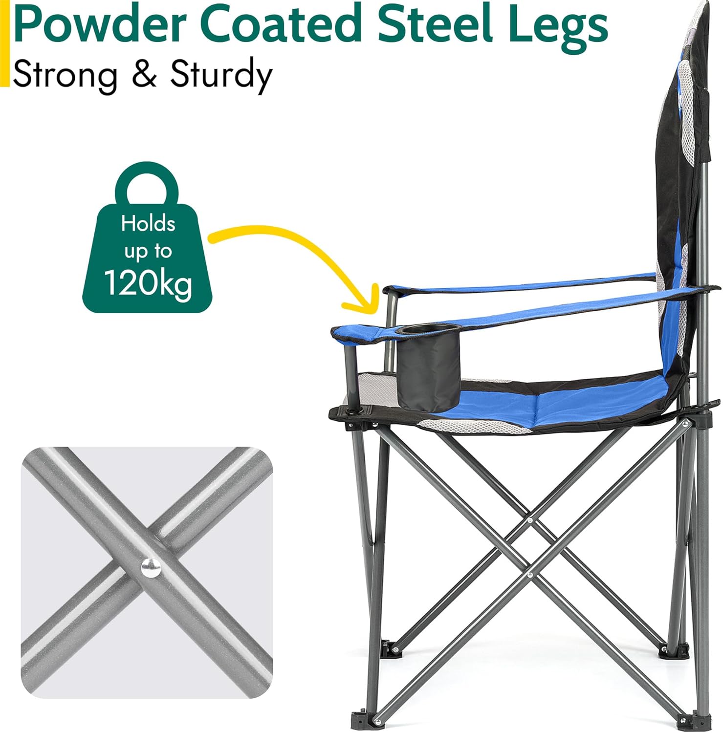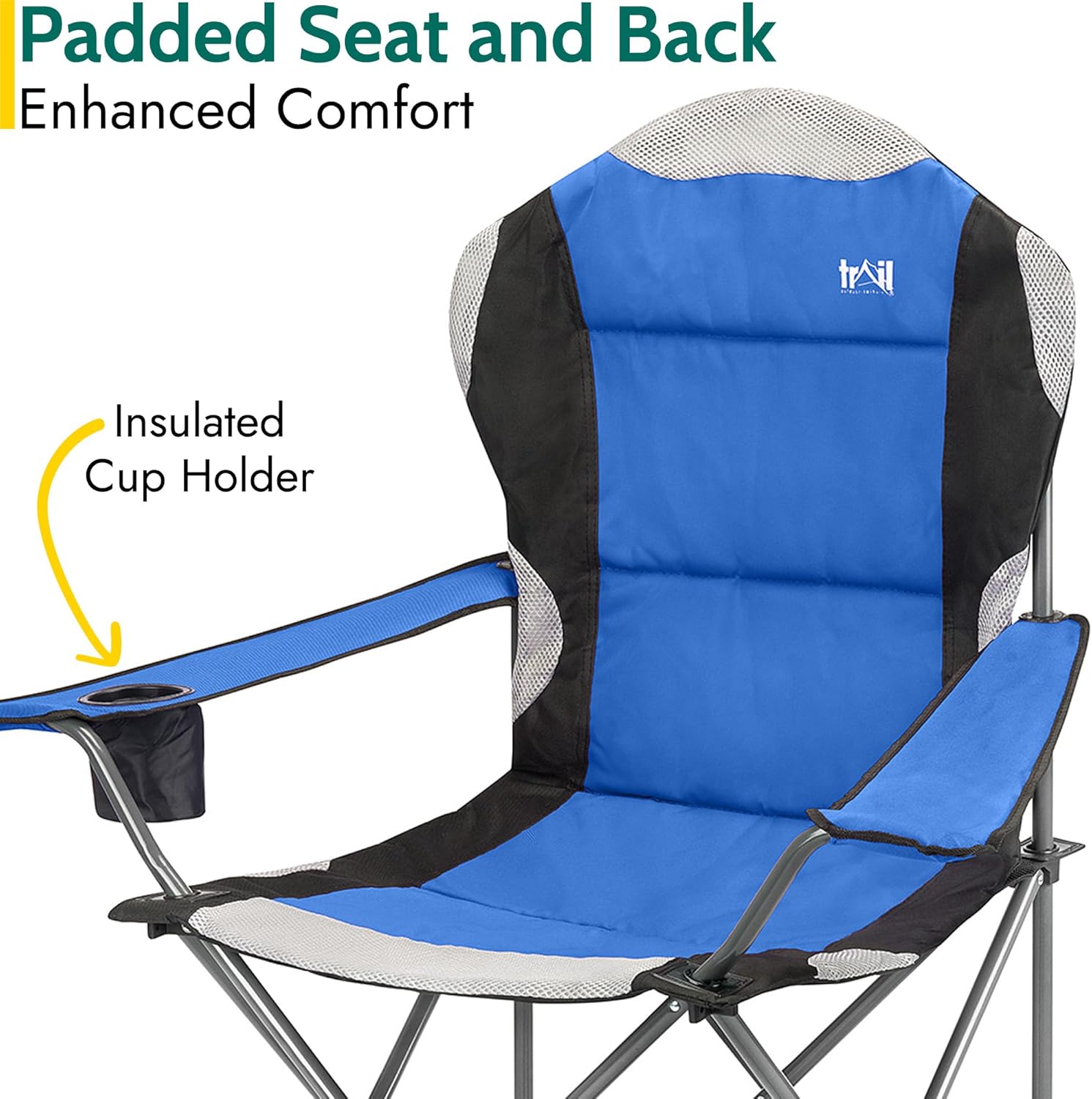 Trail Kestrel High Back Folding Camping Chair, Luxury Padded Seat with Breathable Mesh, Heavy Duty Tubular Steel Frame, Cup Holder Armrest, Lightweight & Portable with Carry Bag (Blue)