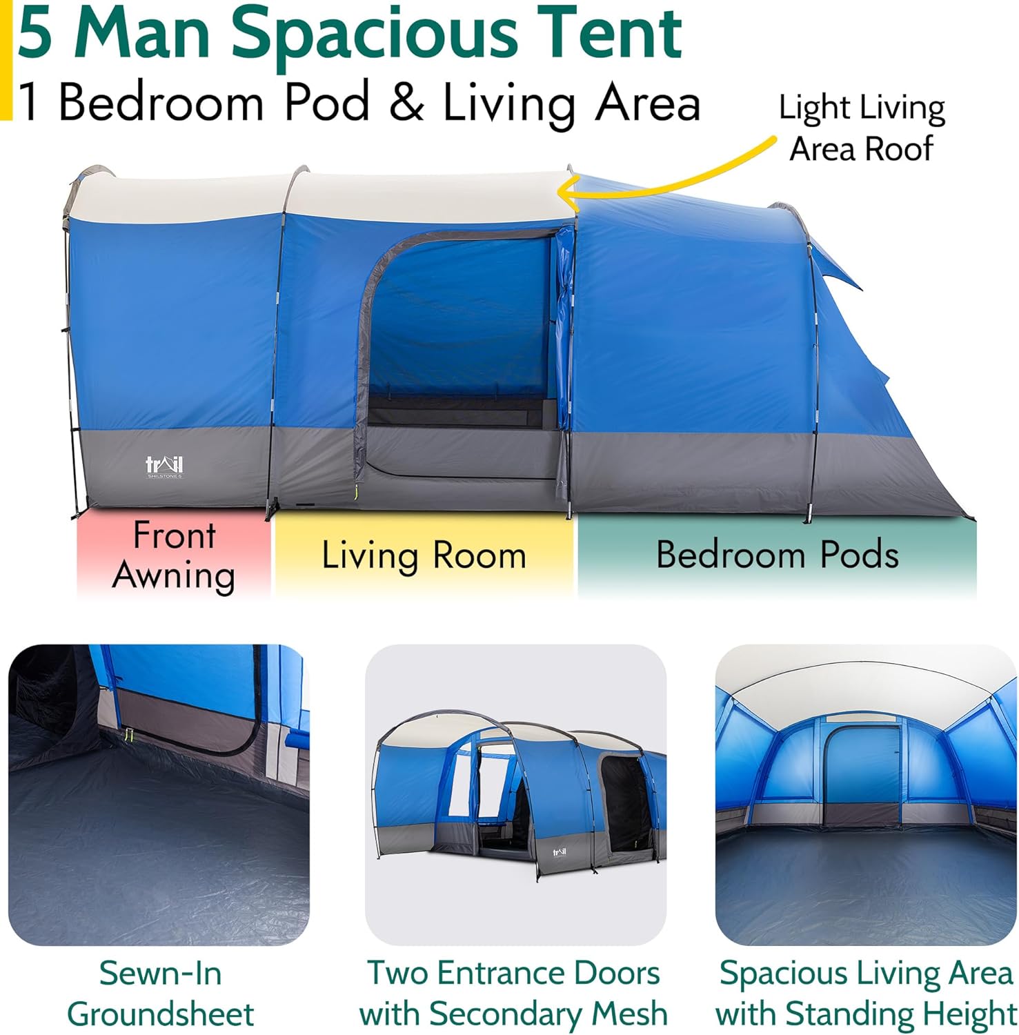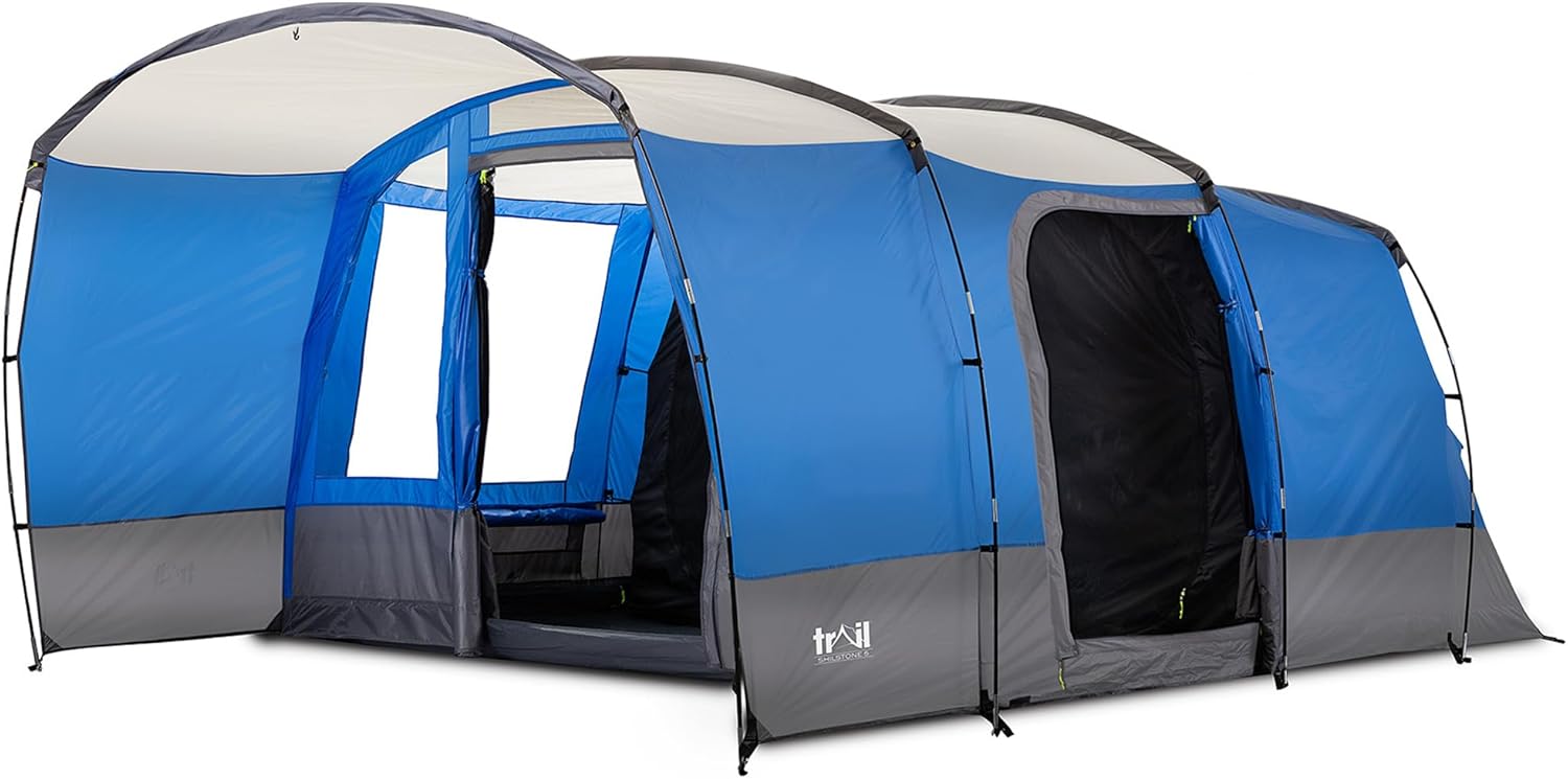 Trail Shilstone 5 Man Tent, Large Family Camping Tunnel Tent, 5000mm Waterproof, Dark Zone Bedroom, Living Area, Standing Height, Front Awning, Cable Access, Bag (L515cm x W330cm x H200cm)