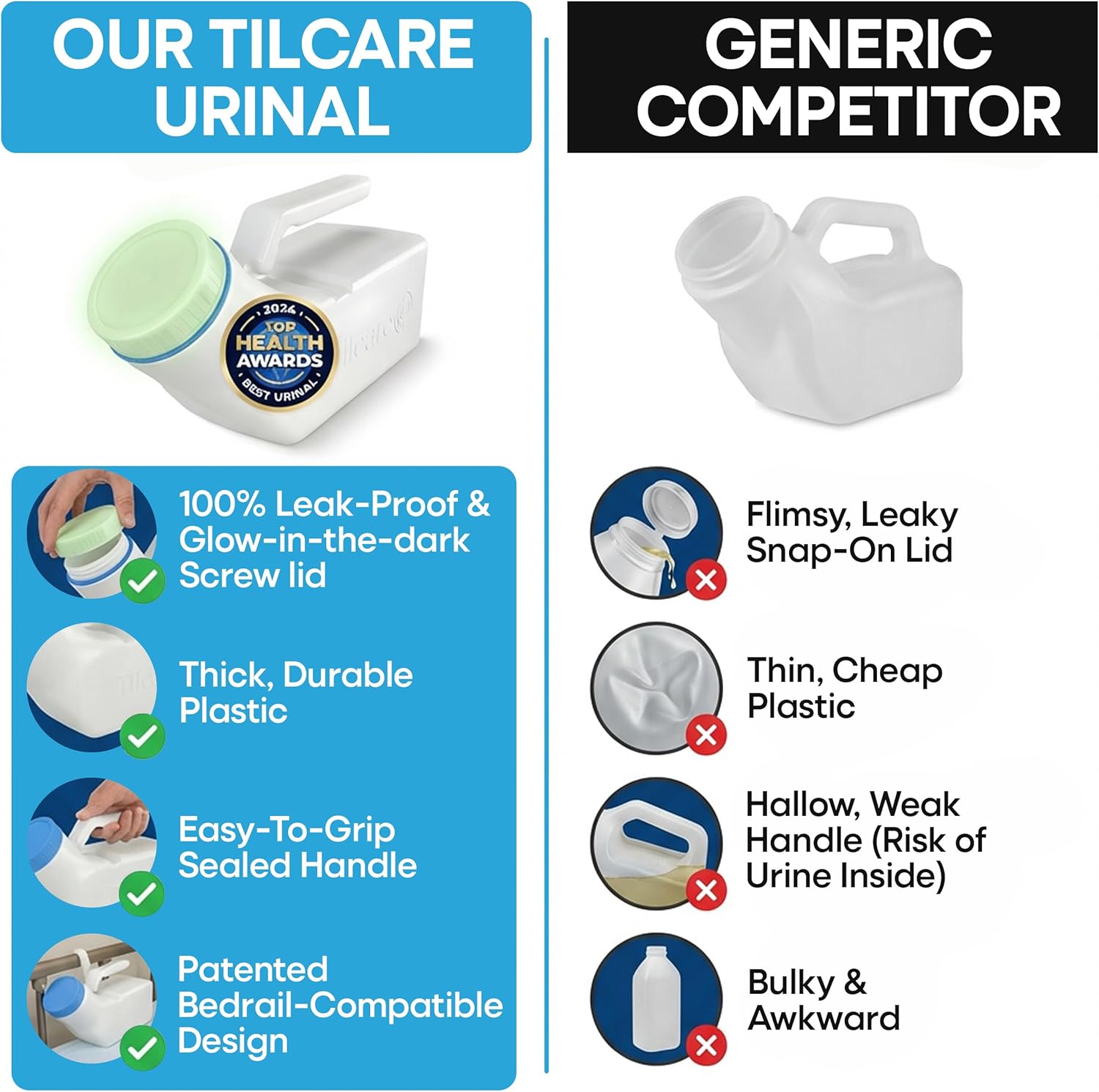 Urinals for Men Glow in The Dark Lid by Tilcare (1 Pack) – 32oz/1000mL Thick Plastic Mens Bedpan Bottle with Screw-on Lid – Spill Proof Urinary Chamber – Male Portable Travel Pee Bottles