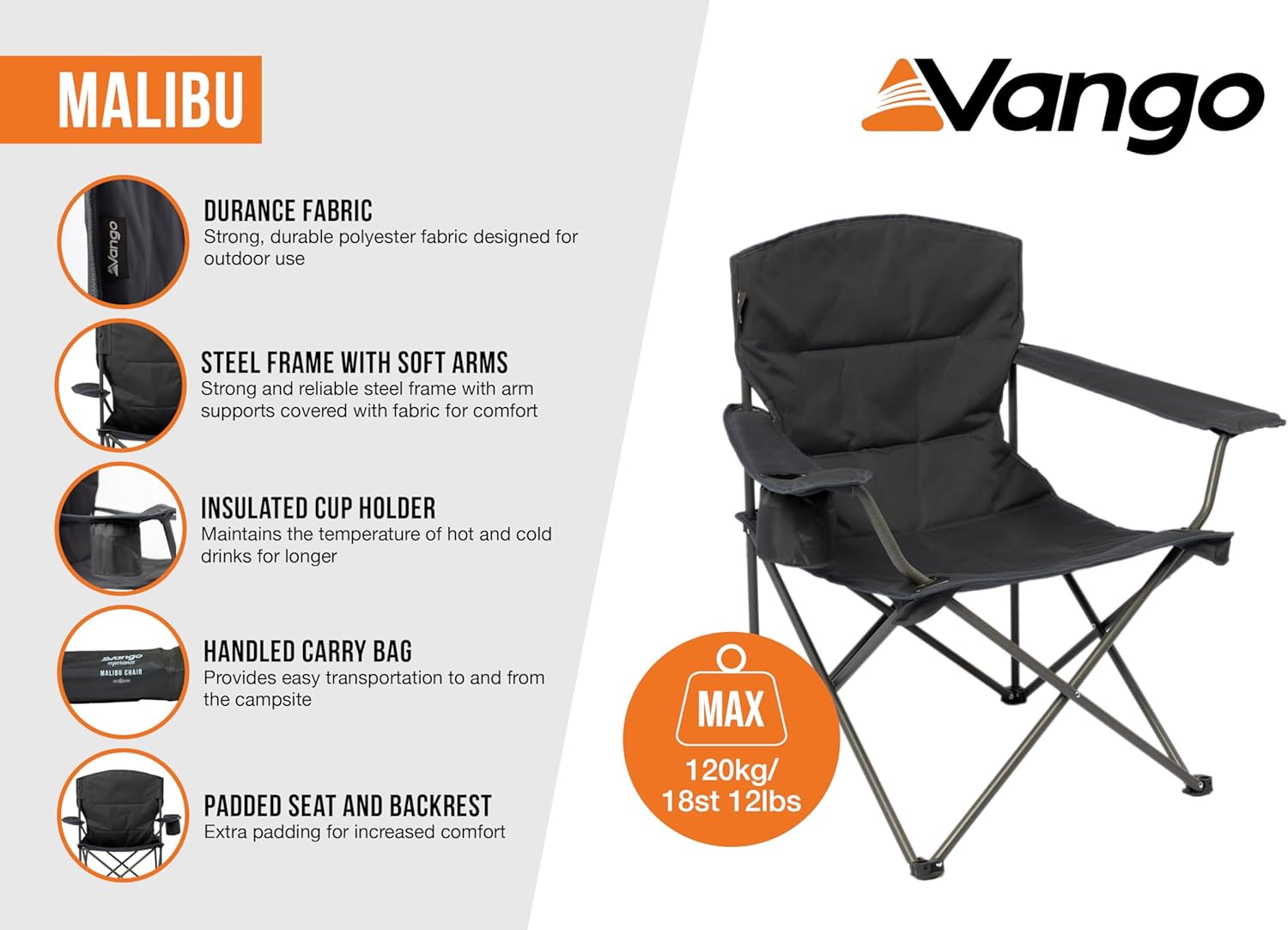 Vango Malibu Padded Camping Chair with Insulated Cup Holder – Folding Portable Outdoor Chair with Steel Frame, Soft Arms & Carry Bag – Durable Fabric for Camping, Festivals, Sports