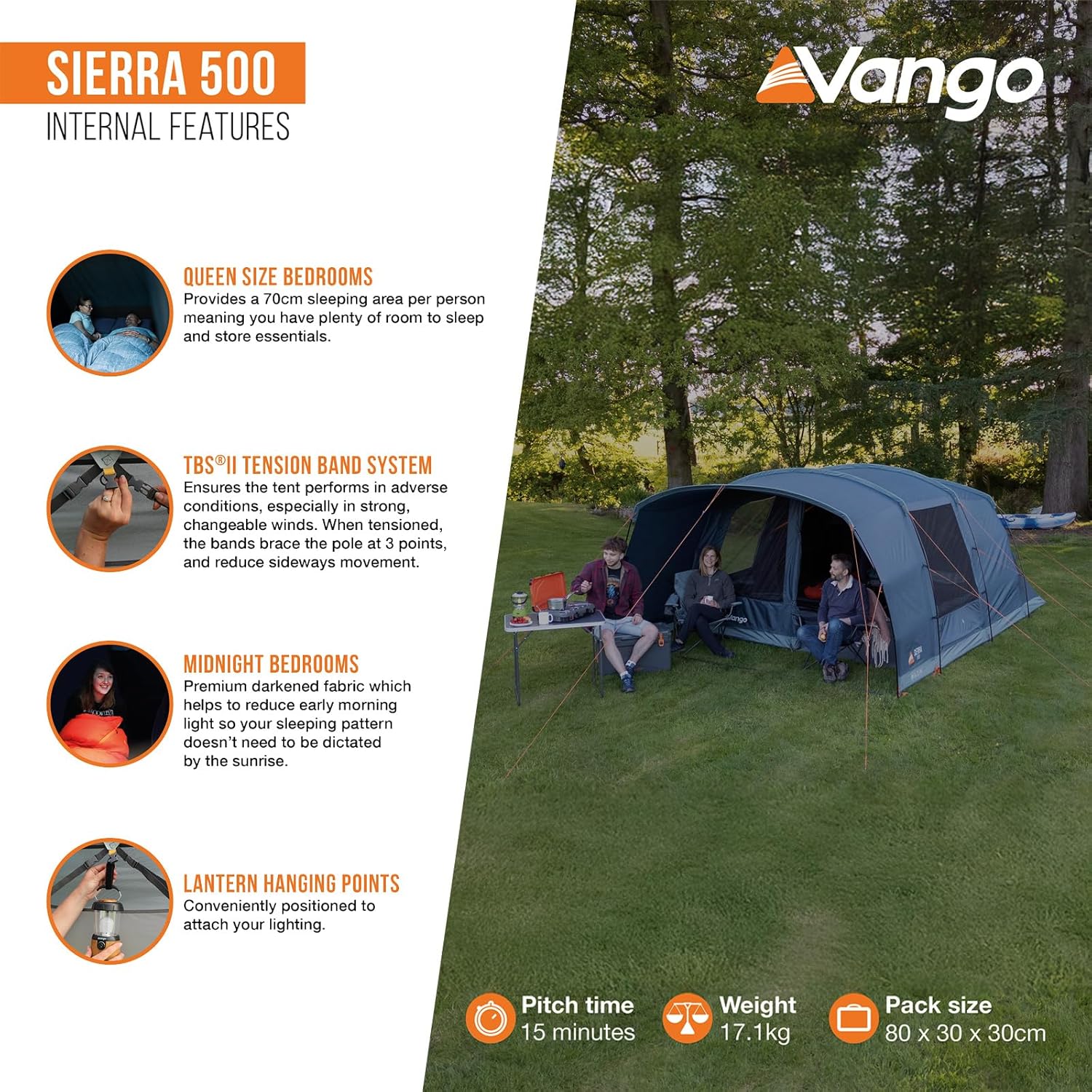 The Vango Sierra 500 tent can accommodate up to 5 people.