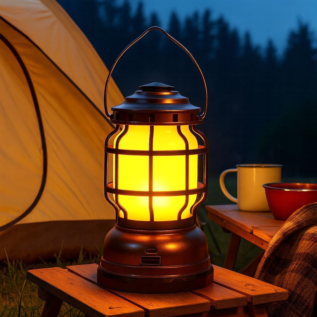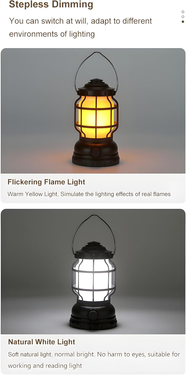 Vintage LED Camping Lantern, 2 Modes (White Light & Flame Effect), Dimmable, USB Output Portable Rechargeable Lamp for Outdoor, Emergency, Home & Decorative Use – 15cm x 10cm