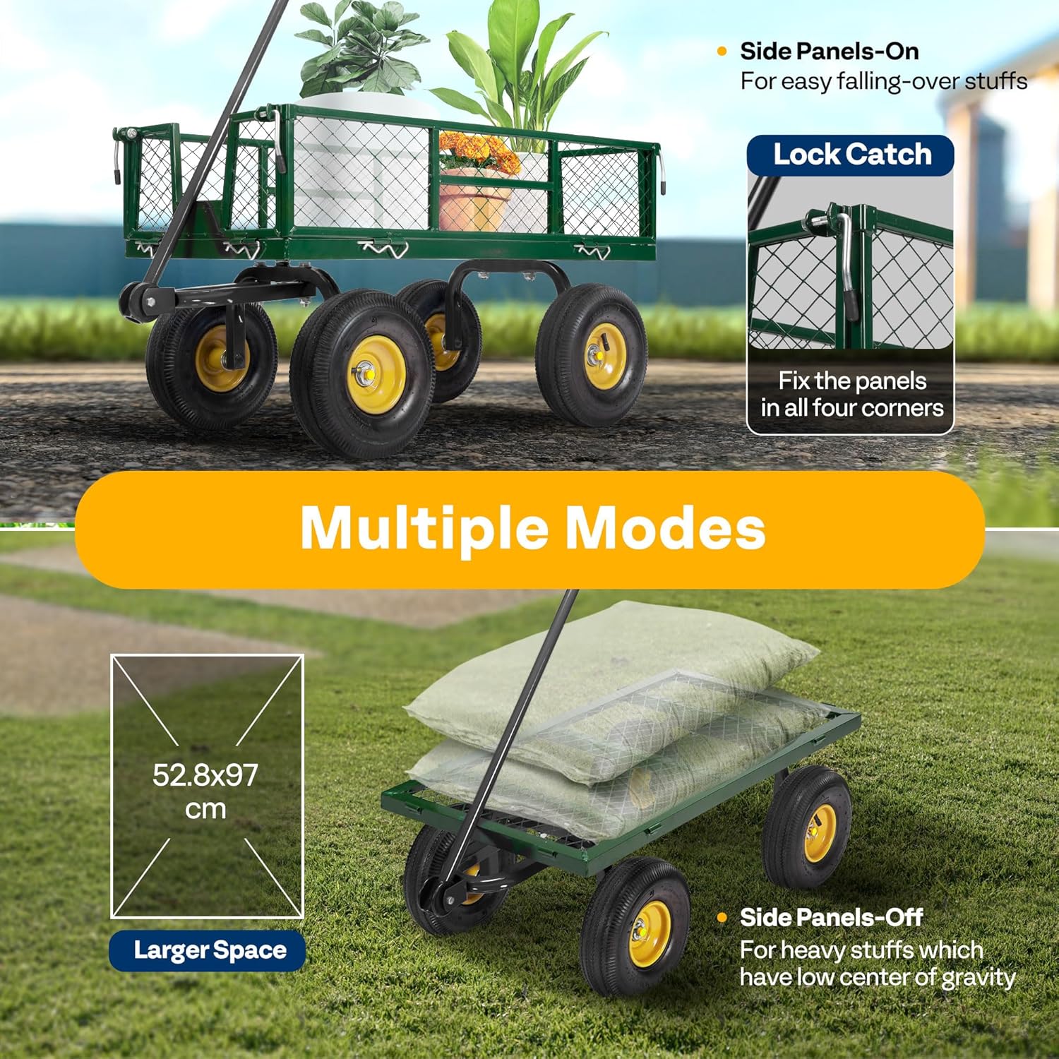 The hand trolley is equipped with 10cm pneumatic tires.