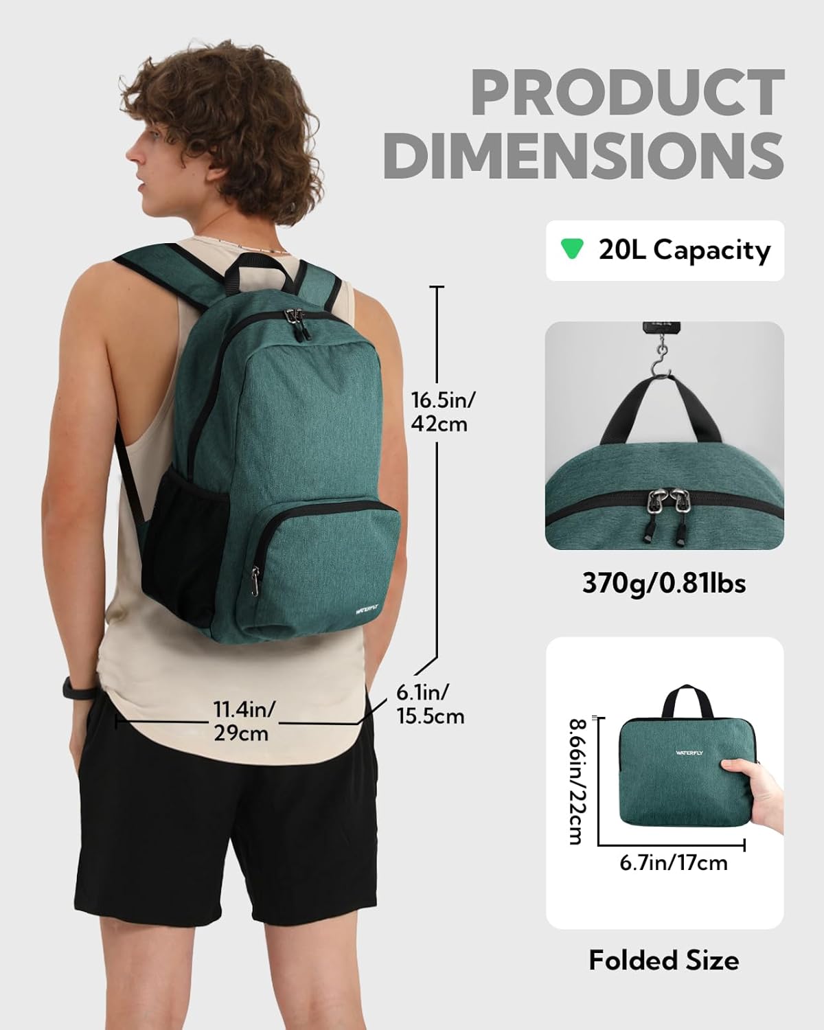 The Waterfly Foldable Backpack has a capacity of 20 liters.