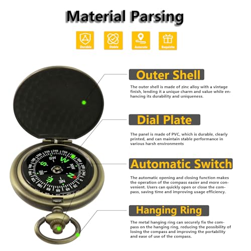 【Retro Bronze Finish】Featuring a striking antique bronze color, the compass combines functionality with a beautiful retro design, making it a perfect accessory for both outdoor adventures and collections.