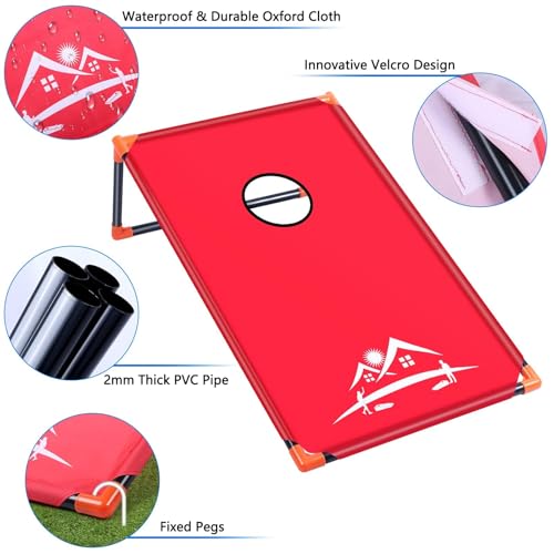 PREMIUM MATERIAL: This cornhole board is made of high-end 420D Nylon fabric, which is professional waterproof, tear-resistant, and anti-skid. The frame is made of thickened strong detachable PVC pipes. The bean bags is filled with premium Polyethylene particles and it’s double lined with tight stitching
