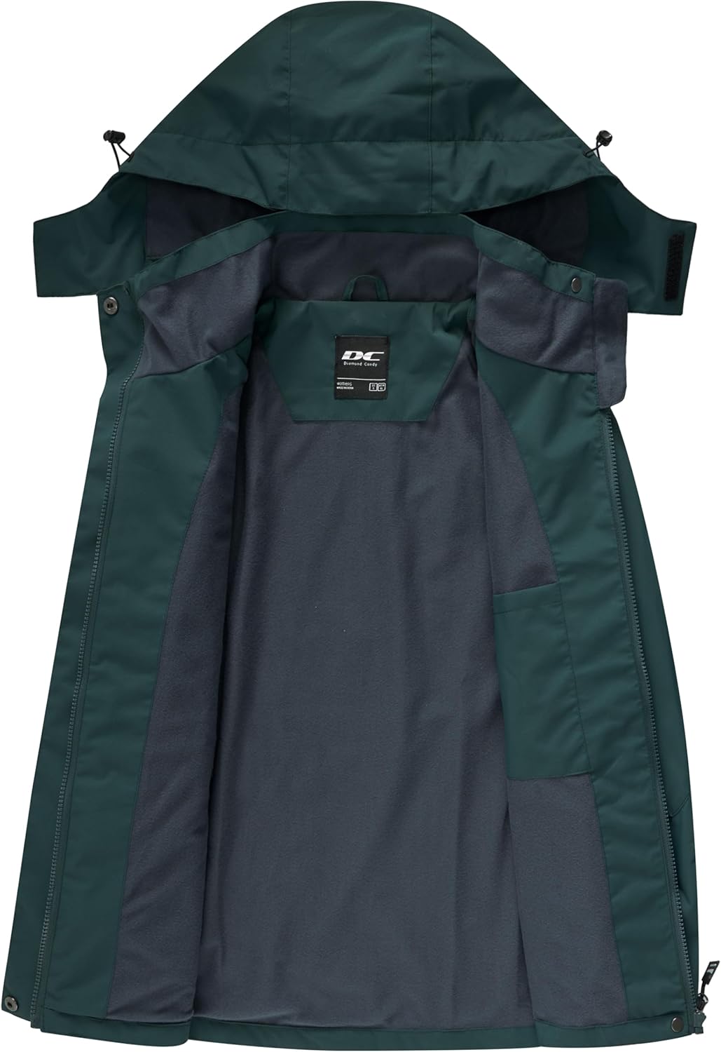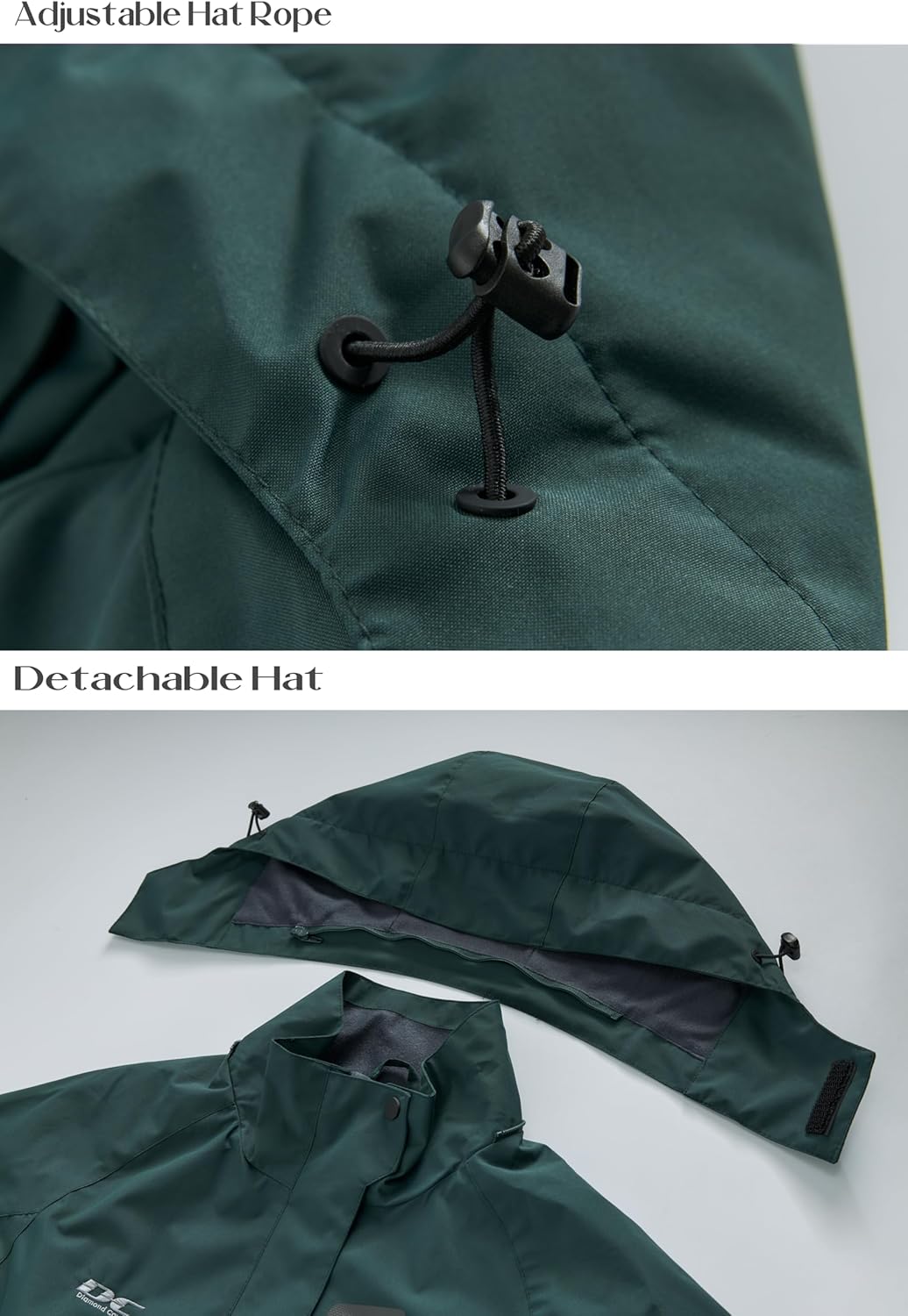 The detachable waterproof hood has an adjustable hidden drawstring.