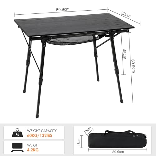 Portal Camping Tables That Fold up 90×53cm Picnic Table Folding Portable with Height Adjustable Legs Collapsible 3ft Aluminium Rollup Outdoor Lightweight Foldable for Beach Fishing Garden BBQ