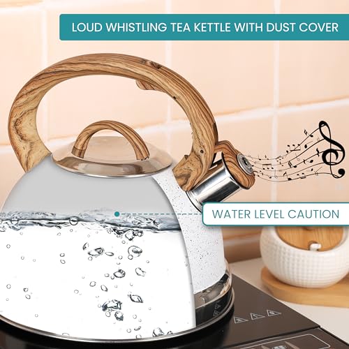 STAINLESS STEEL KETTLE: Made from food-grade stainless steel, our white textured whistling tea kettle is rustproof, corrosion-resistant, durable and sturdy. The teapot has a capacity of 3L (101oz) and the metal base provides rapid boiling with uniform heating.