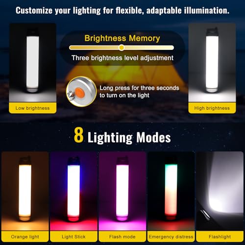 MULTIFUNCTIONAl CAMPING LANTERN: Whether you’re into camping or outdoor adventures, this versatile camping light is a must-have! It offers 8 modes: three brightness levels, orange light, light stick, flash, emergency distress, and flashlight. Perfect for power outages, hurricanes, camping, hiking, night walks, fishing, gatherings, and more
