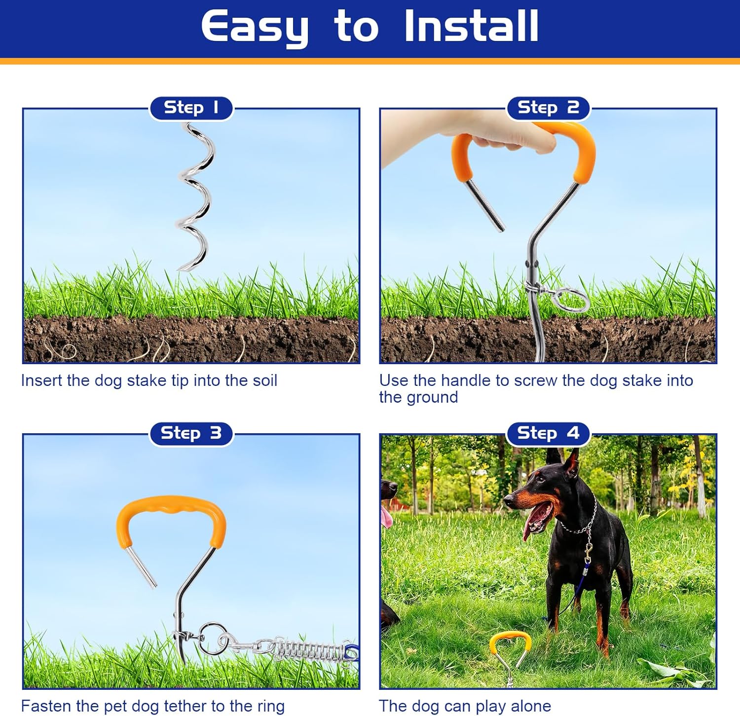 【Easy to Use】Grip the handle of the dog stake, stand it vertically on the ground, turn it clockwise to make it deep into the soil, then connect one end of the leash to the swivel ring of the dog stake, and the other end is fixed to the dog’s collar or leash, and then your dog is free to explore instantly.