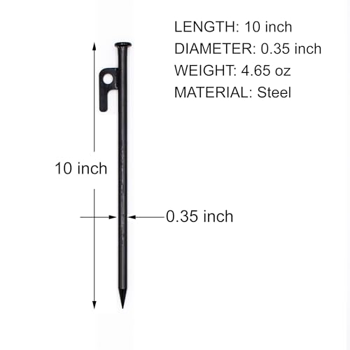 [Material]: Heavy duty tent pegs made from high quality steel, coated to resist rust and corrosion. Full metal one piece steel pegs without any plastic parts to ensure integrity.