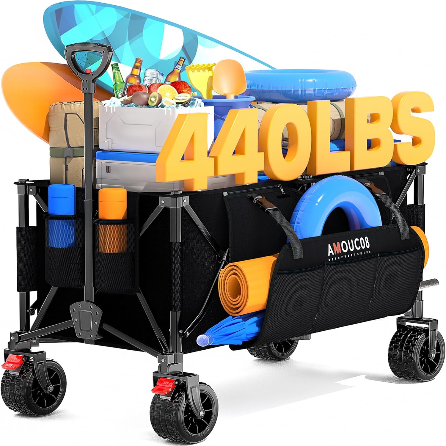 Heavy-duty utility wagon with rugged all-terrain wheels shown outdoors. Text indicates 440 lbs weight capacity. Features black fabric construction and collapsible design.Heavy-duty utility wagon with rugged all-terrain wheels shown outdoors. Text indicates 440 lbs weight capacity. Features black fabric construction and collapsible design.