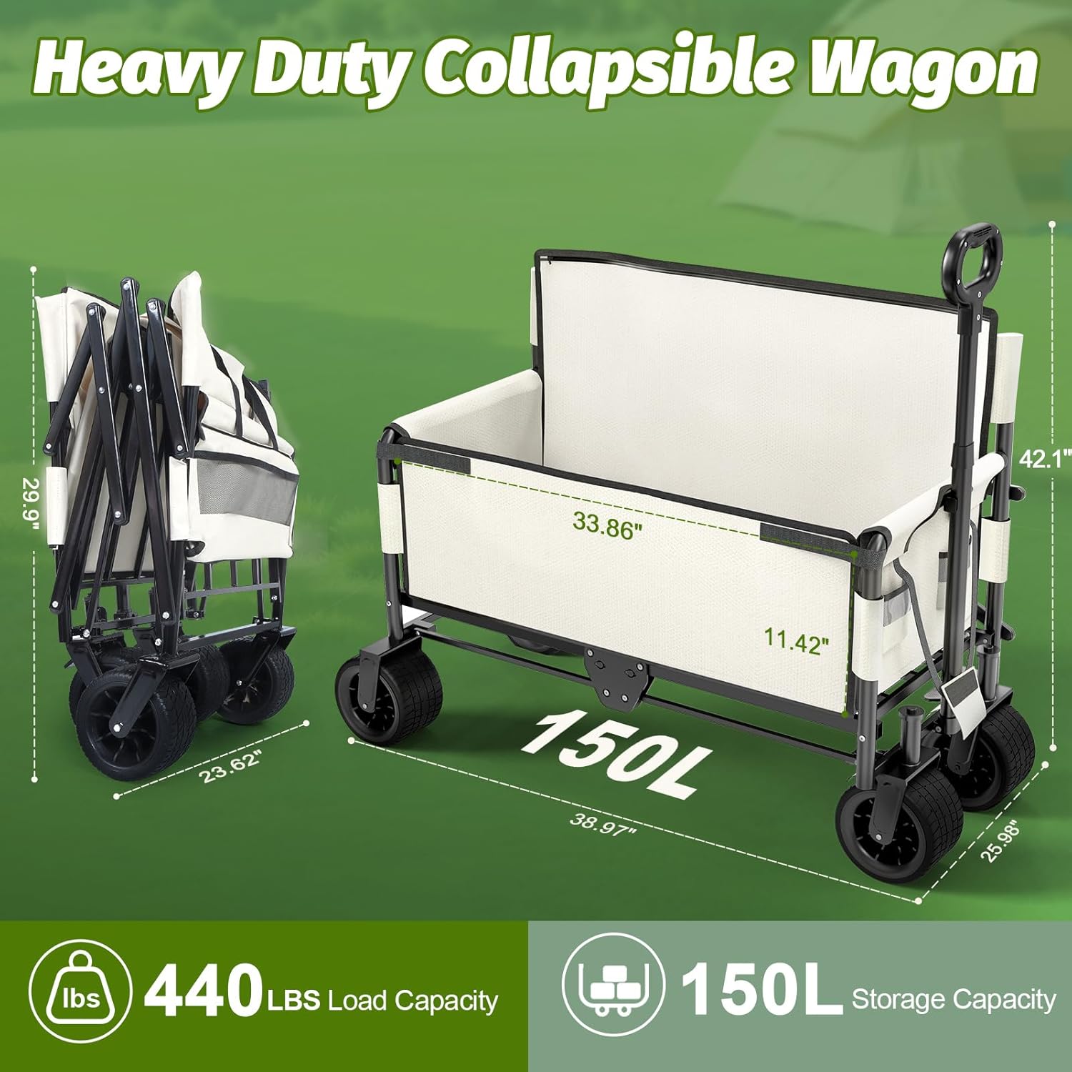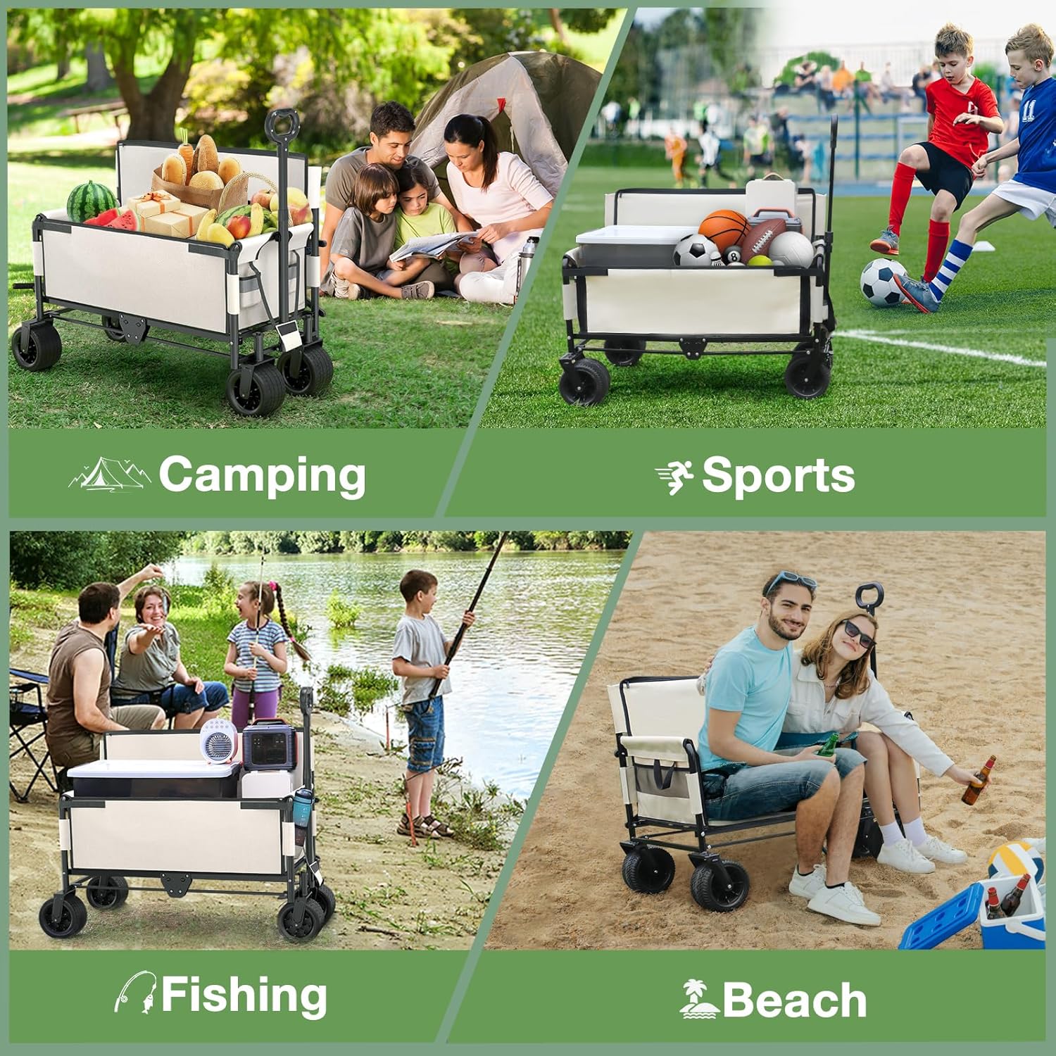 【Large Capacity Collapsible Wagon】Our camping trolley cart boasts an impressive 150L capacity. The innovative design includes a large built-in storage bag integrated into the sofa back, along with two Side cup Pocket, increasing usable storage space by up to 20% compared to traditional models. Make it easy for you to carry all the essentials and enjoy unlimited outdoor life. Its collapsible design makes it incredibly easy to store at home, in the garage, or in the trunk of your car.
